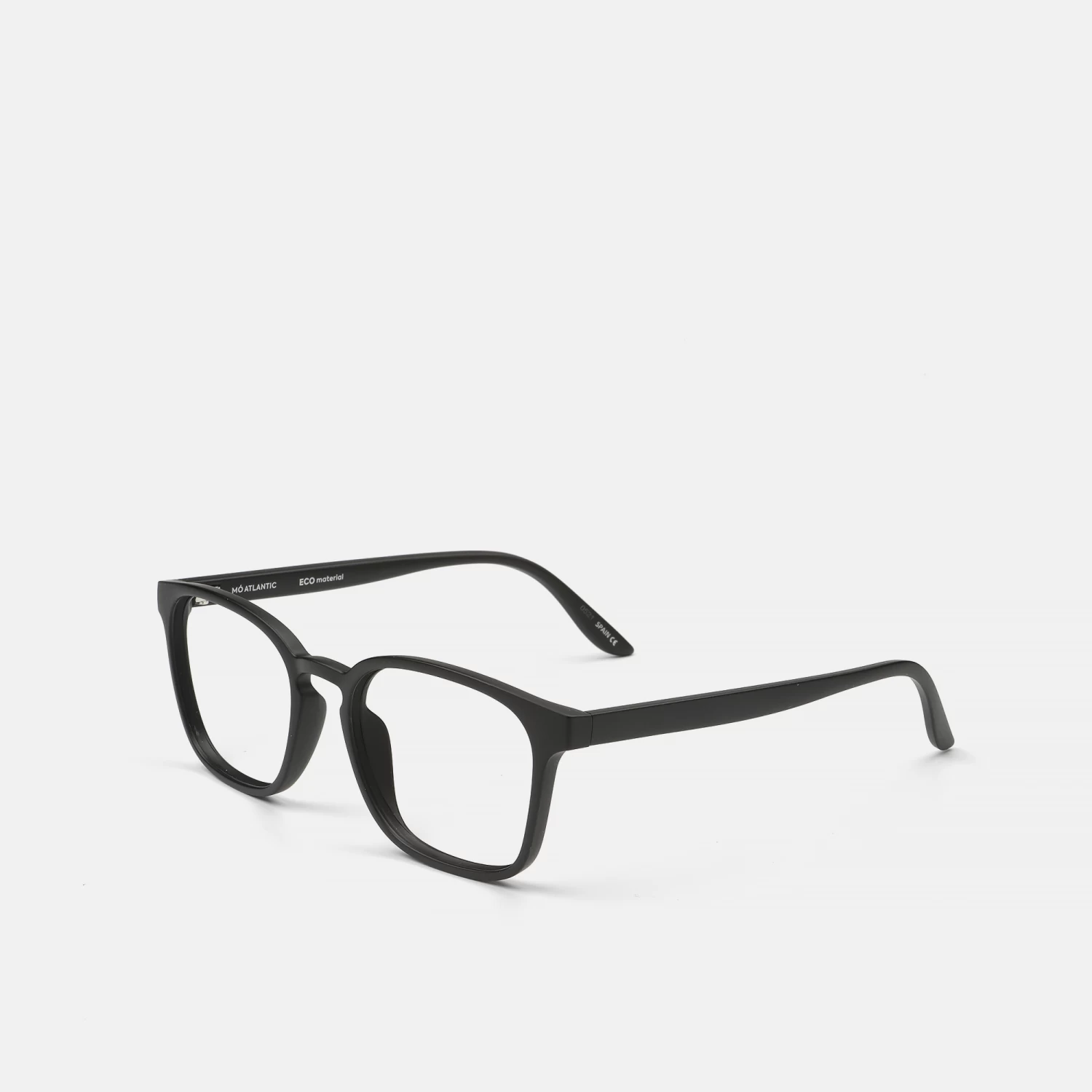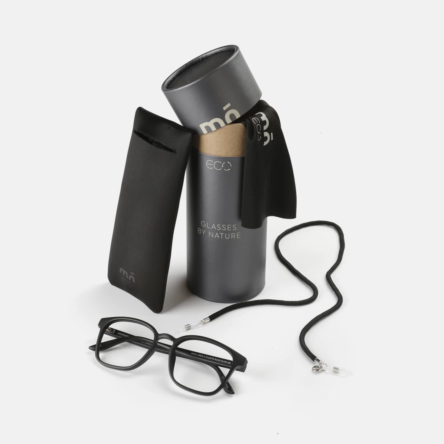 Gafas unisex con silueta rectangular en color negro, fabricadas partir de botellas de plástico recicladas. Este modelo viene acompañado de un PACK ECO compuesto por una cajita de cartón reciclado, pouch, gamuza y cordón de poliéster reciclado a juego con la montura.