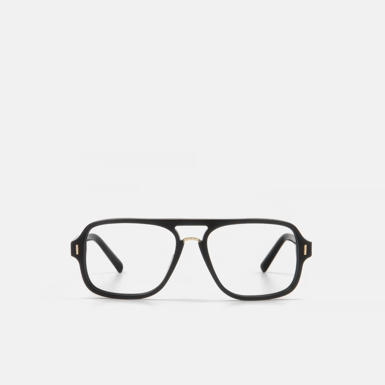 Gafas para hombre, con silueta aviador, de acetato negro, creadas en colaboración con el diseñador Juan Avellaneda. Destacan su puente metálico dorado y decoraciones metálicas con forma de bambú. Este modelo viene acompañado de un pack compuesto por una cajita estampada con uno de los motivos más icónicos del diseñador, un estuche redondeado en tono amarillo y una gamuza a juego.
