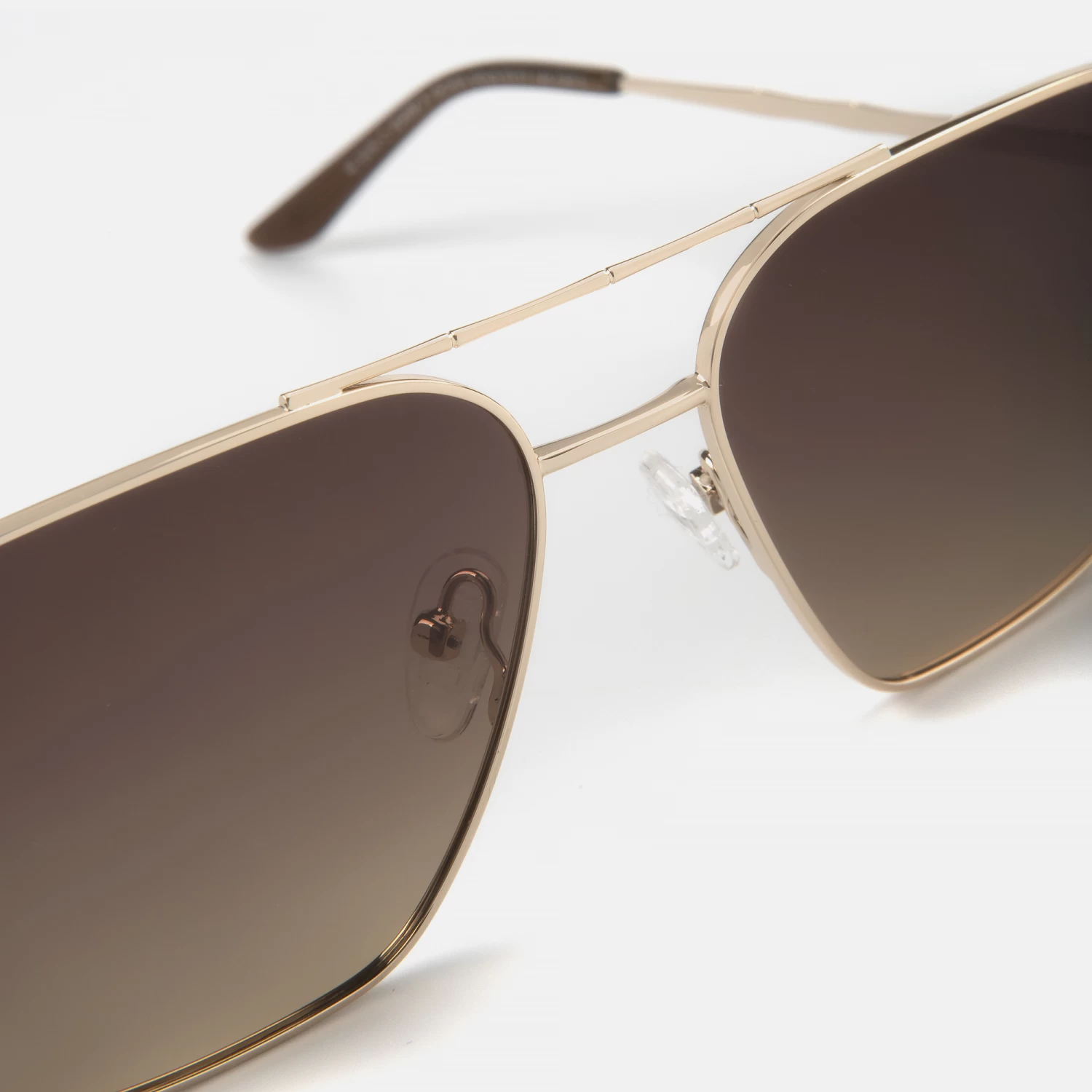 Gafas de sol para hombre, con silueta aviador, de metal dorado, creadas en colaboración con el diseñador Juan Avellaneda. En la barra superior del frente y las varillas destacan unos relieves emulando el bambú. Sus lentes marrón degradado polarizadas proporcionan una visión más nítida y un mejor contraste. Este modelo viene acompañado de un pack compuesto por una cajita estampada con uno de los motivos más icónicos del diseñador, un estuche redondeado en tono amarillo y una gamuza a juego.