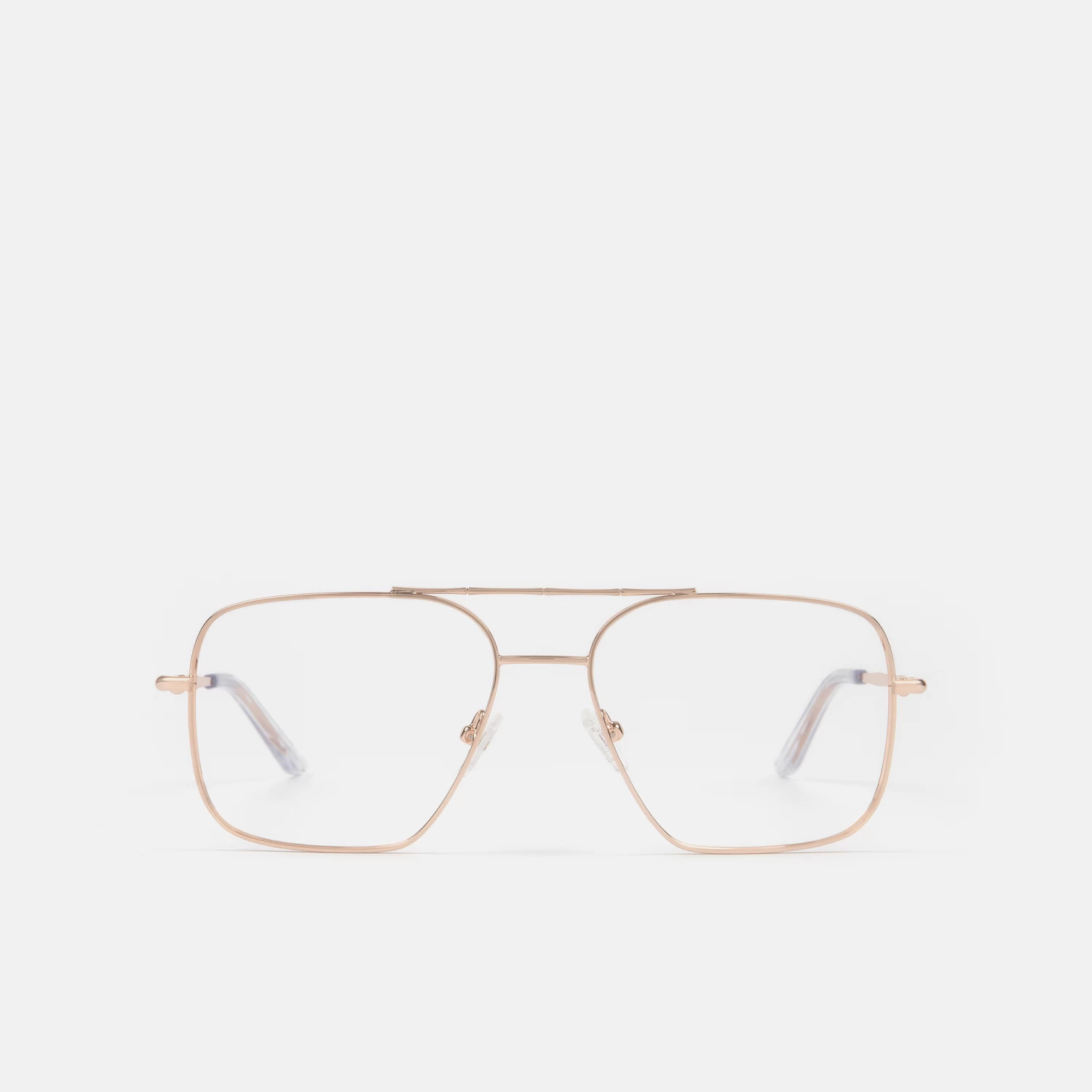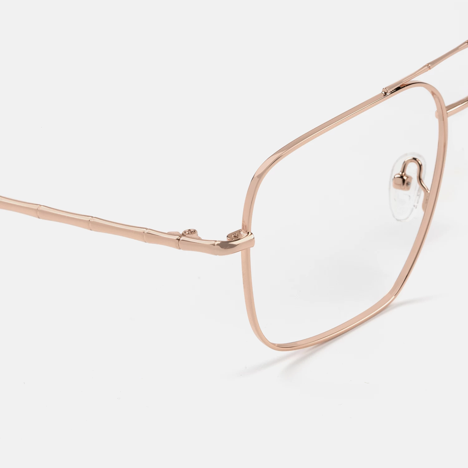 Gafas para hombre, con silueta aviador, de dorado rosado, creadas en colaboración con el diseñador Juan Avellaneda. En la barra superior del frente y las varillas destacan unos relieves tipo bambú. Este modelo viene acompañado de un pack compuesto pa estampada con uno de los motivos más icónicos del diseñador, un estuche redondeado en tono naranja y una gamuza a juego.