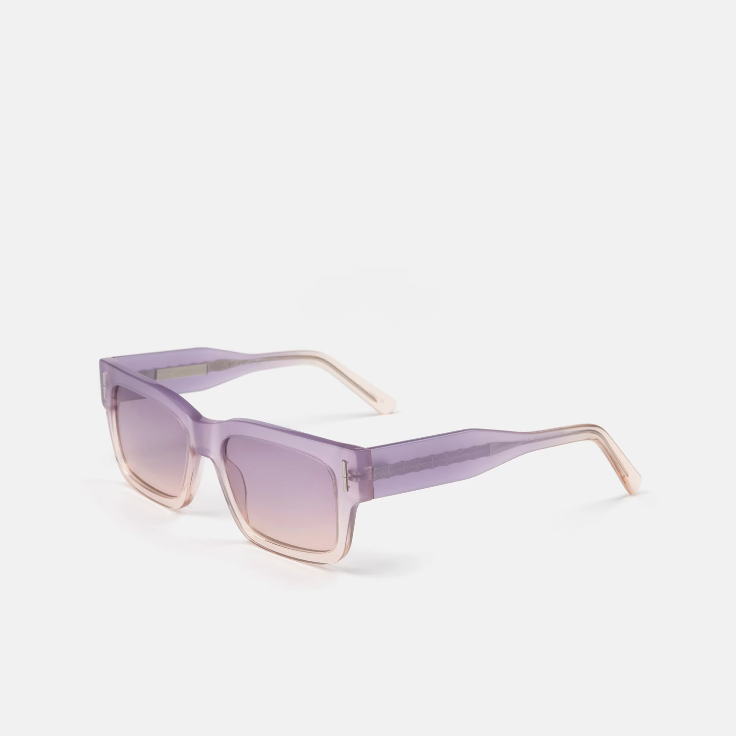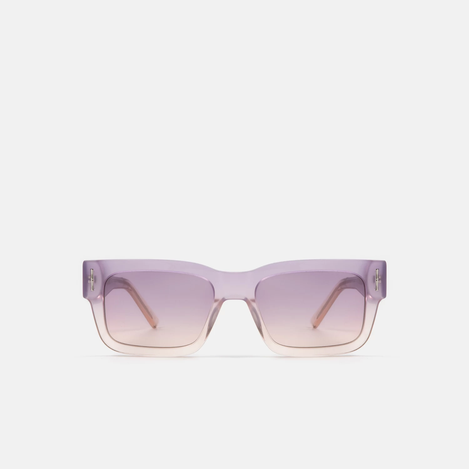 Gafas de sol unisex, con silueta rectangular angulosa, de acetato rosa degradado, creadas en colaboración con el diseñador Juan Avellaneda. En las varillas y frente, destacan sus apliques tipo bambú . Sus lentes bicolor degradadas proporcionan una viuna visión más nítida y un mejor contraste. Este modelo viene acompañado de un pack compuesto por una cajita estampada con uno de los motivos más icónicos del diseñador, un estuche redondeado en tono naranja y una gamuza a juego.