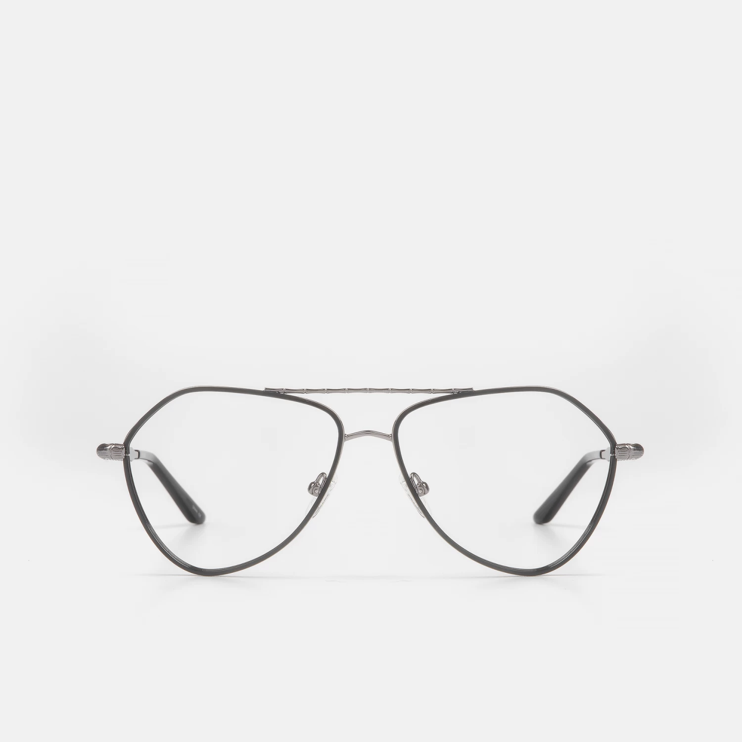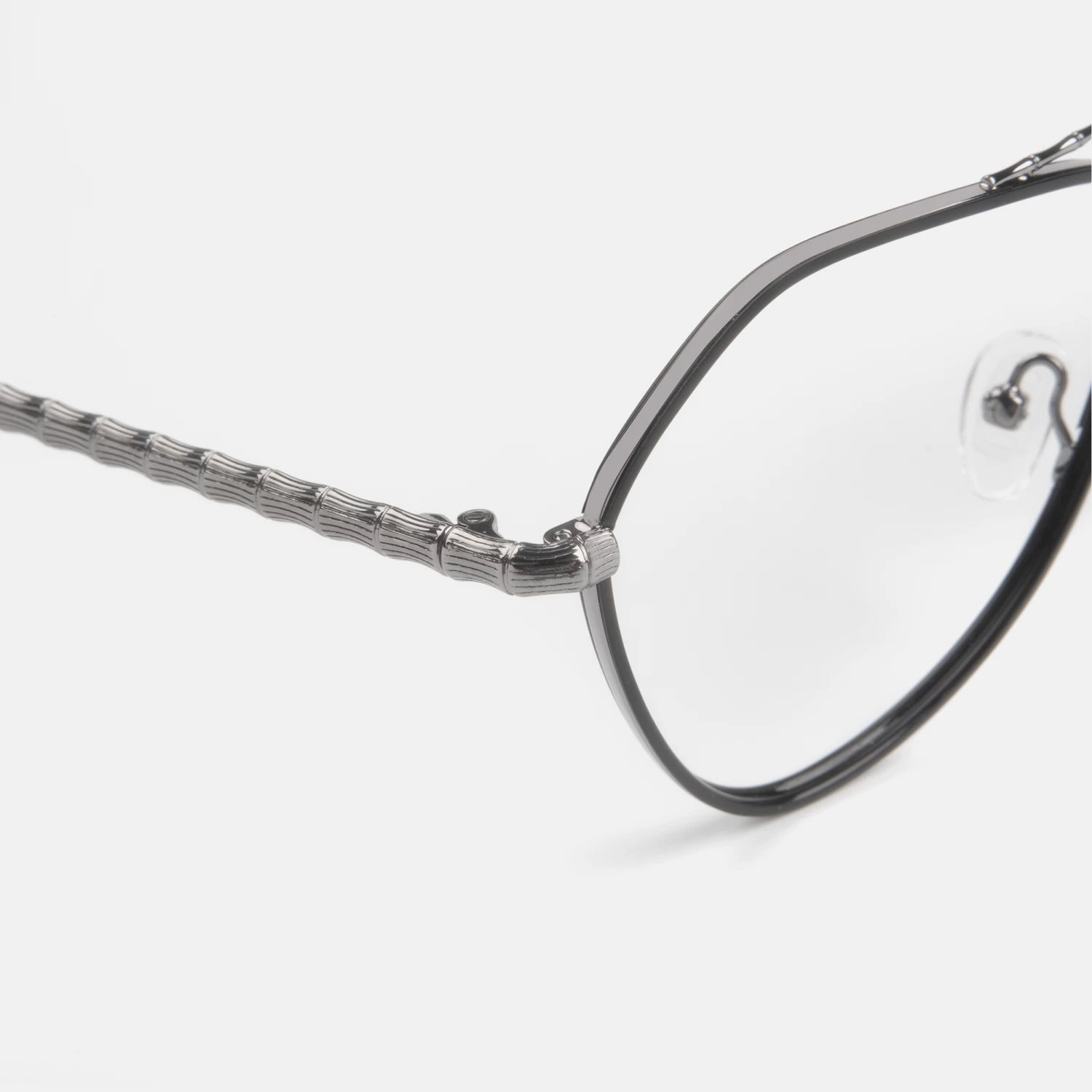 Gafa unisex, con silueta aviador, en color gun metal y aro negro, con detalles en relieve en forma de bambú tanto en el puente como en la varilla, creadas en colaboración con el diseñador Juan Avellaneda. Este modelo viene acompañado de un pack compuesto por una cajita estampada con uno de los motivos más icónicos del diseñador, un estuche redondeado en tono negro y una gamuza a juego .