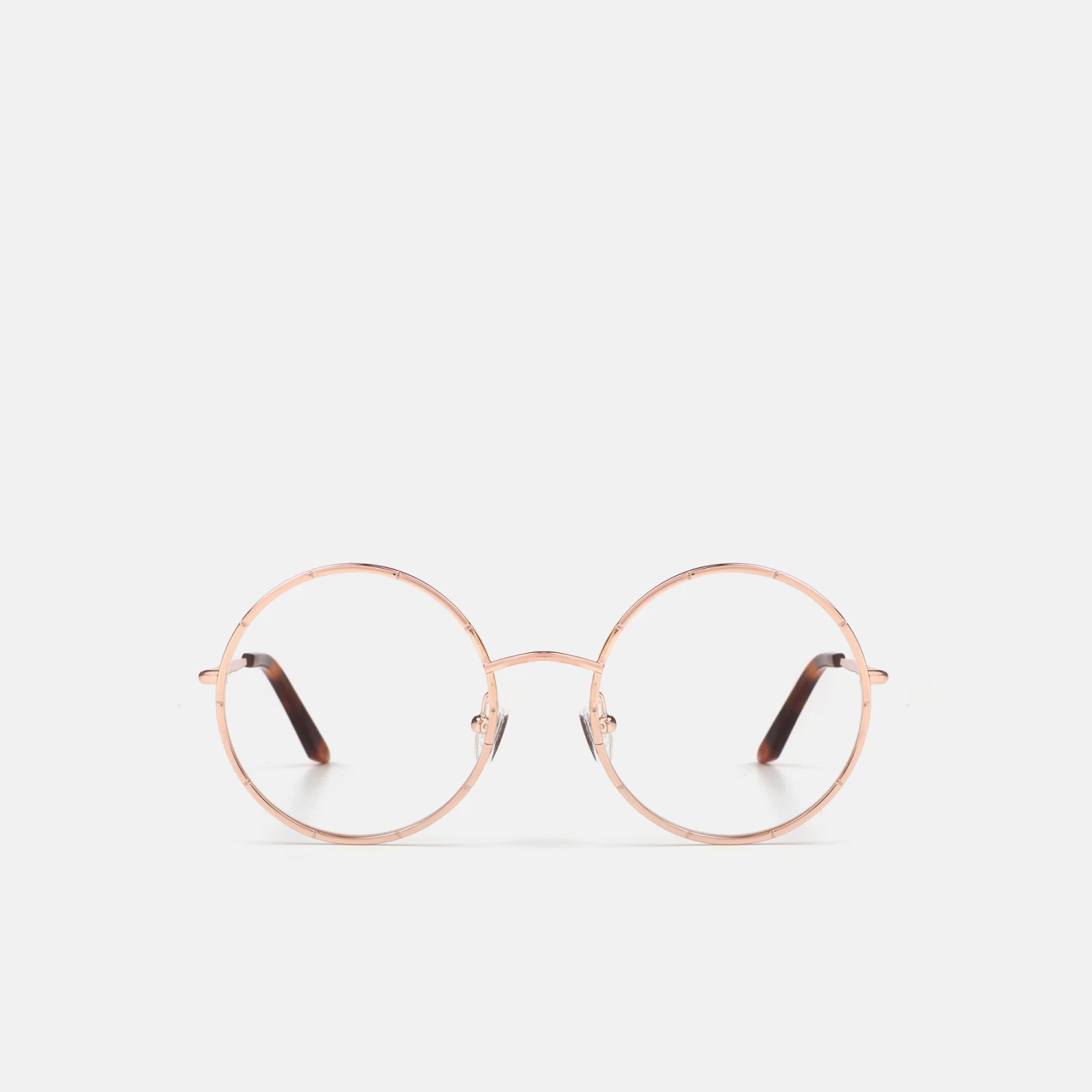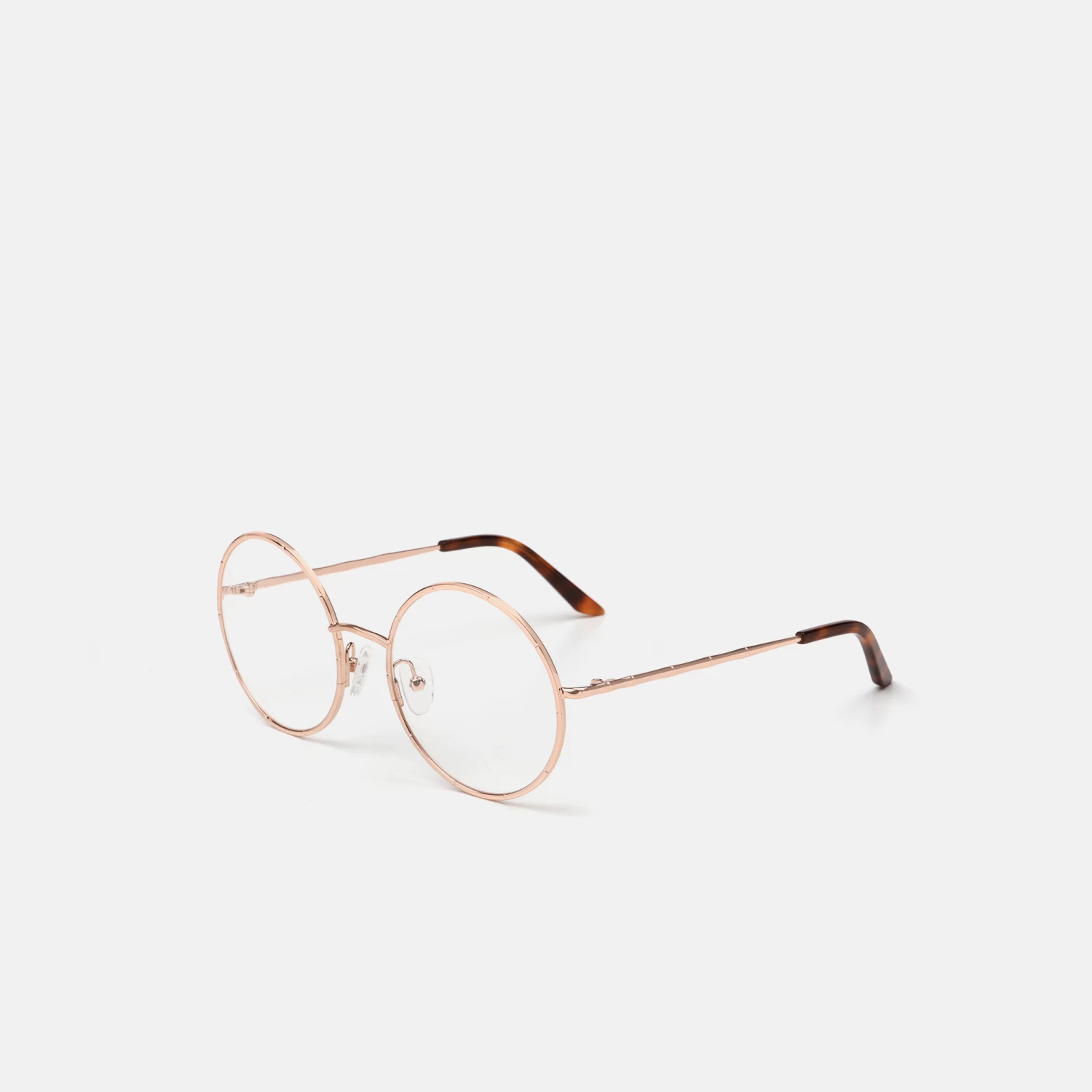 Gafas para mujer, con silueta redonda de metal rose gold, diseñadas en colaboración con el diseñador Juan Avellaneda.