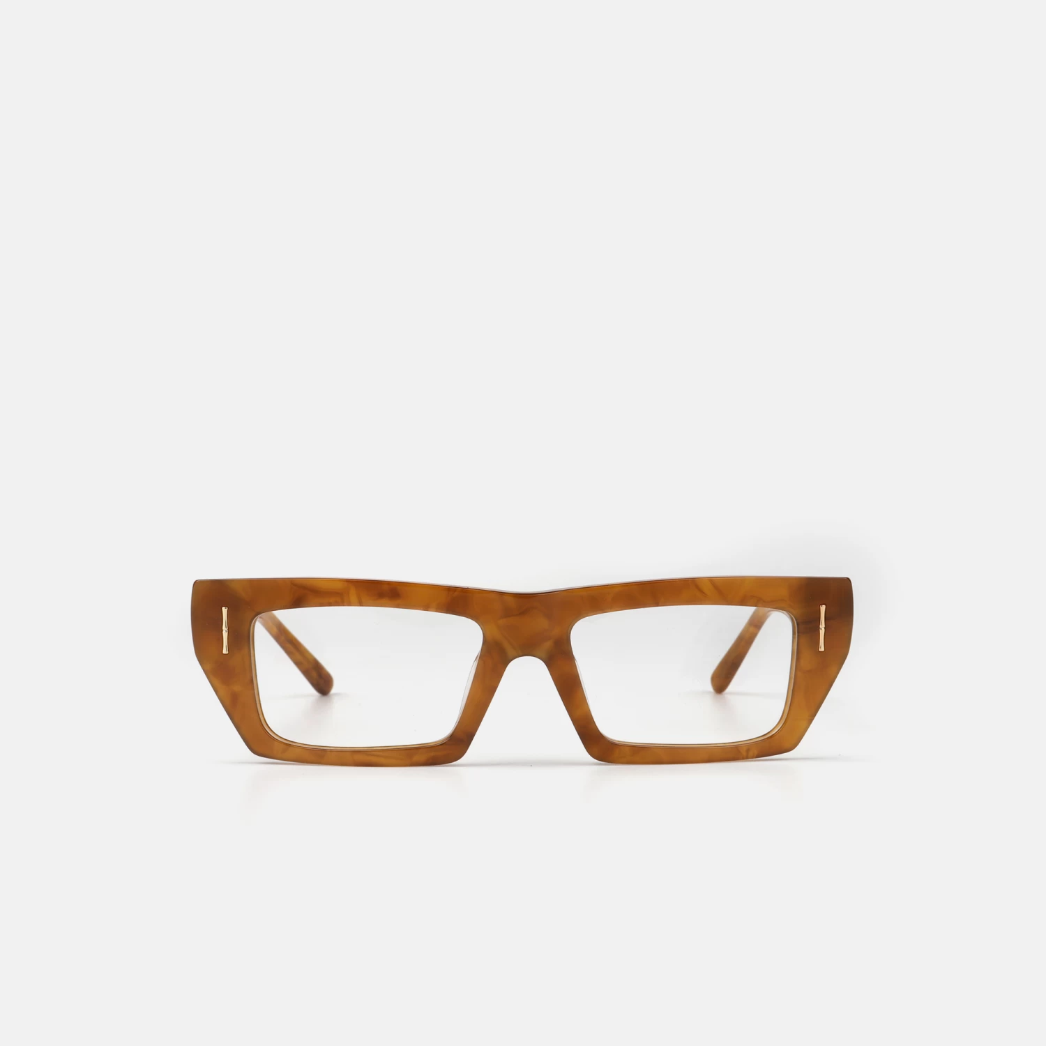 Gafas unisex, con silueta rectangular de acetato color ámbar, diseñadas en colaboración con el diseñador Juan Avellaneda . En las varillas, destacan sus apliques de metal dorado que emulan el bambú. Este modelo viene acompañado de un pack compuesto por una cajita estampada con uno de los motivos más icónicos del diseñador, un estuche redondeado en todo burdeos y una gamuza a juego.