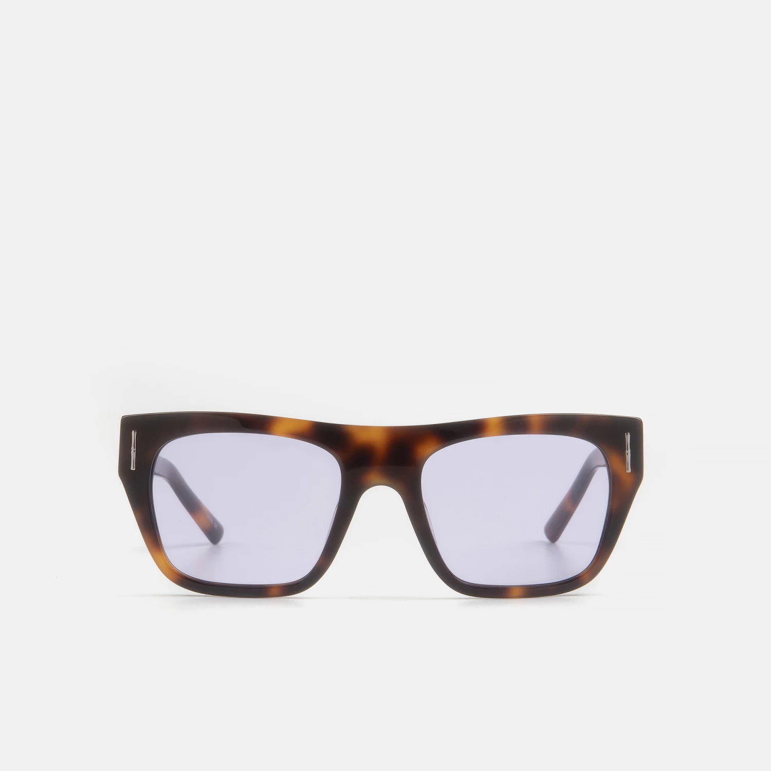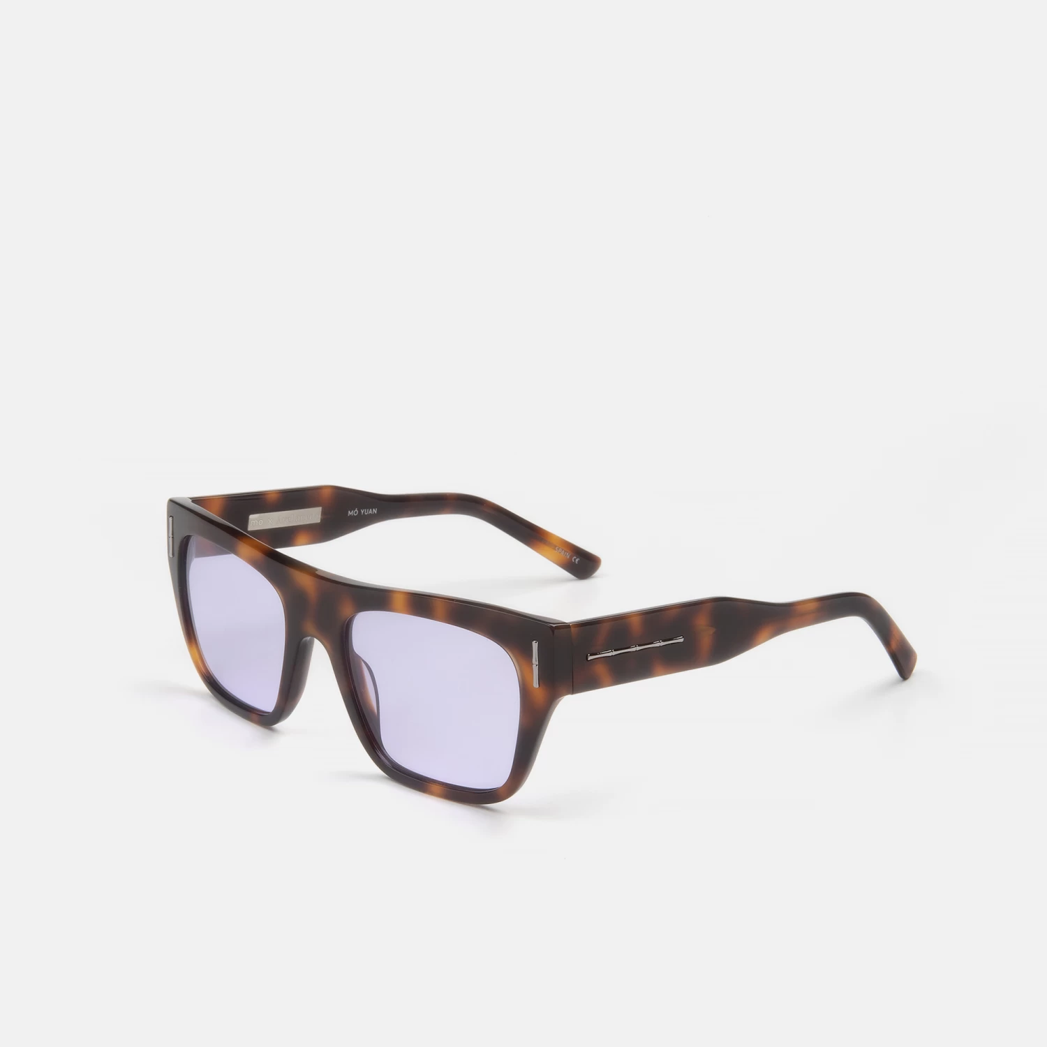 Gafas de sol para hombre, con silueta cuadrada angulosa, de carey con perfil ancho, creadas en colaboración con el diseñador Juan Avellaneda. En las varillas y frente, destacan sus apliques en dorado emulando el bambú y sus lentes moradas.