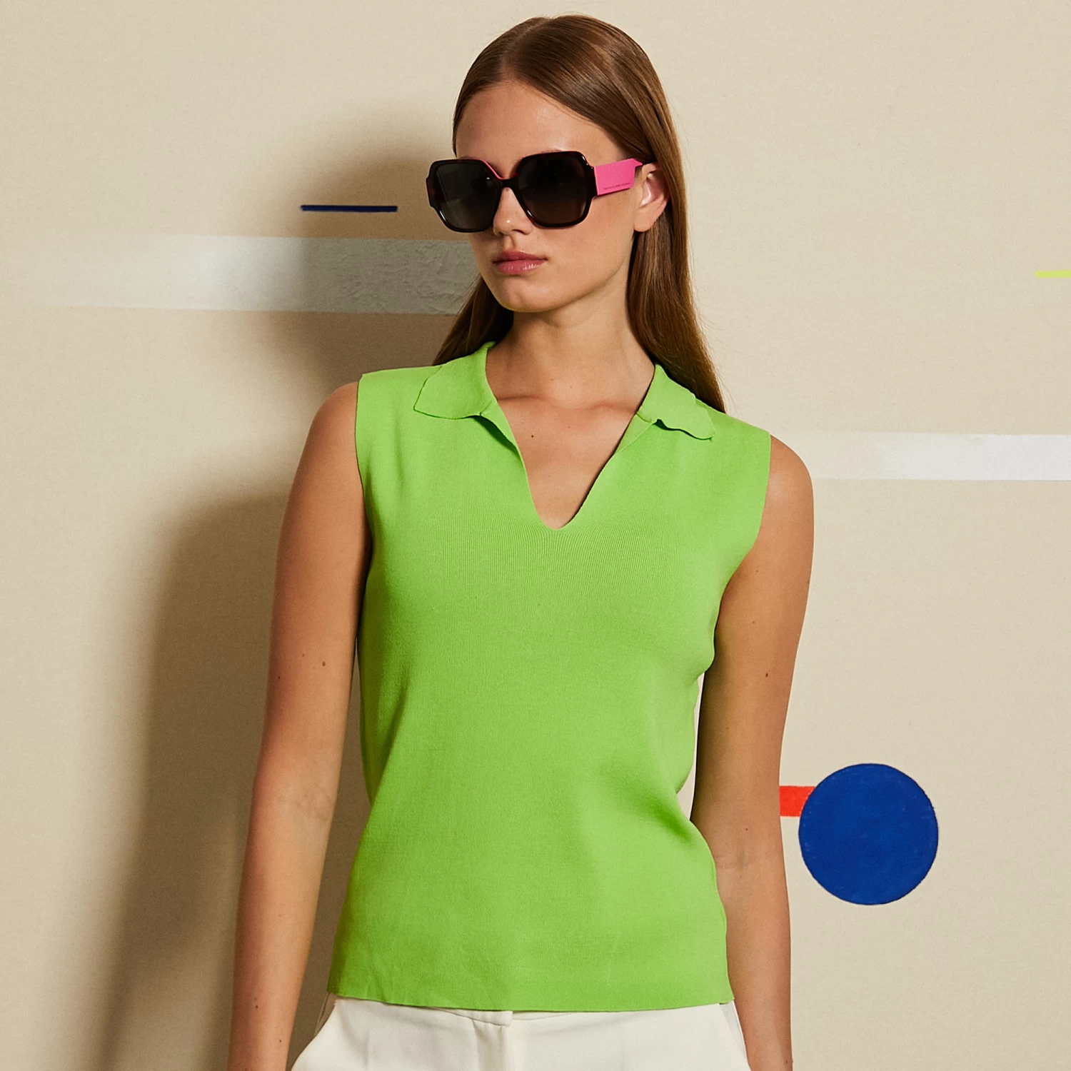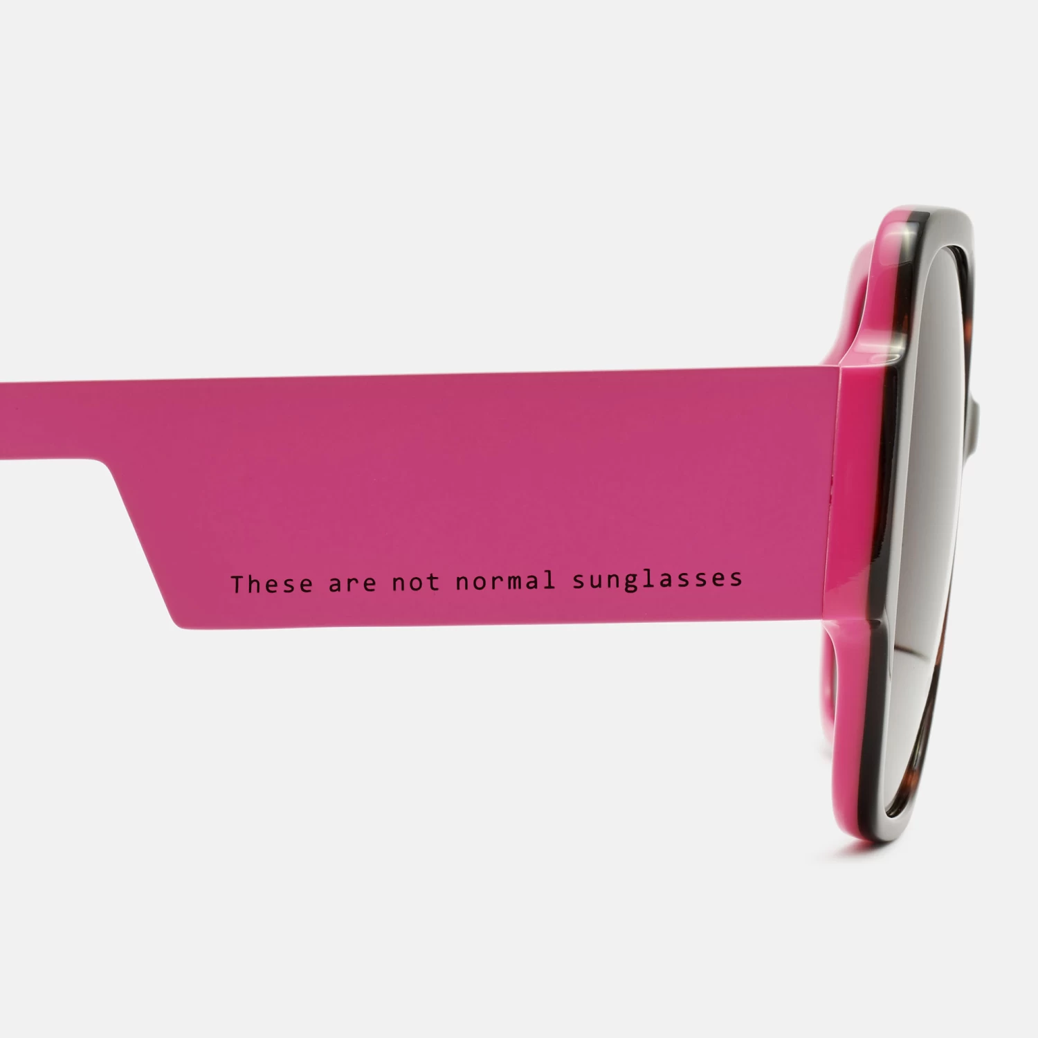 Gafas de sol para mujer, con forma cuadrada, de acetato grueso carey con varilla ancha de metal rosa flúor. Descubre la frase impresa en su varilla! Sus lentes grises degradadas son polarizadas de alta calidad, para una mejor protección y confort.
