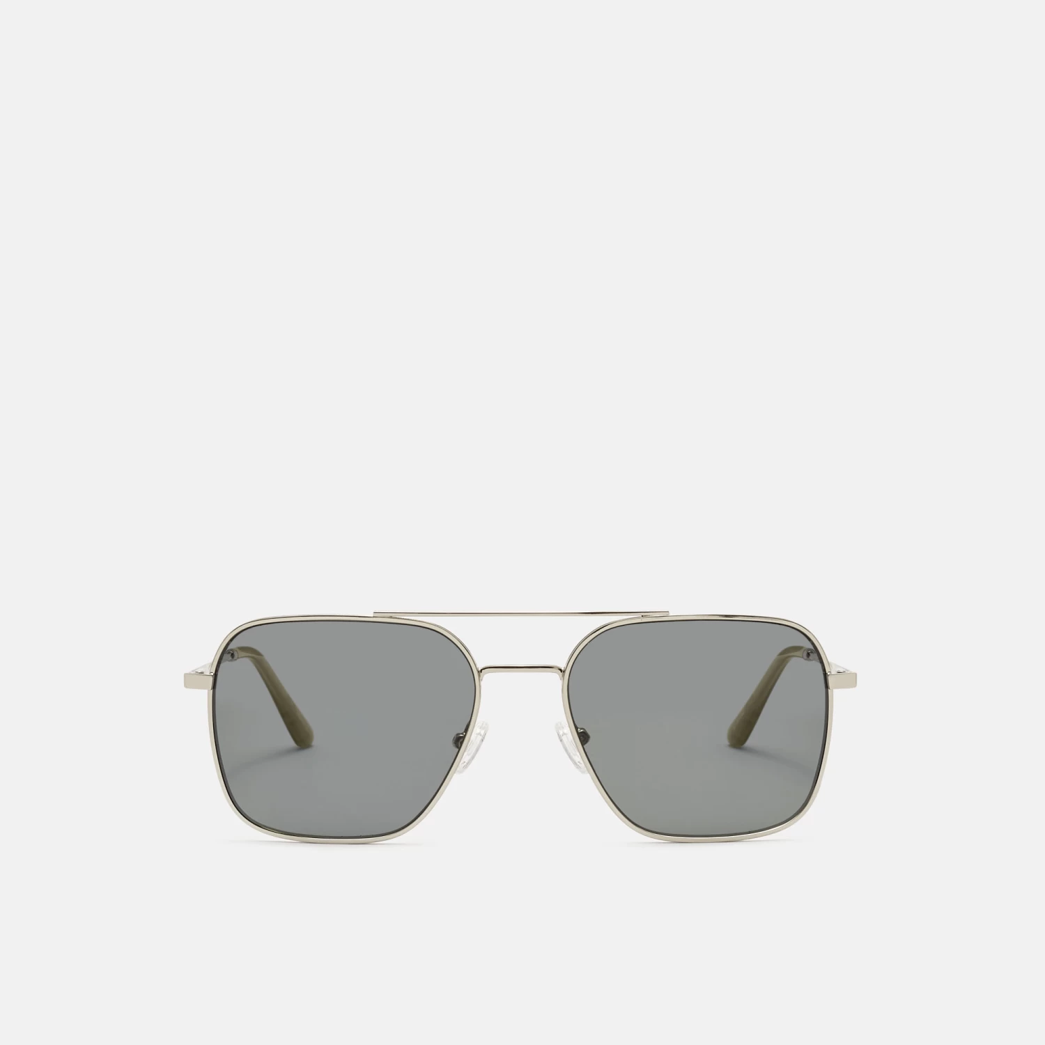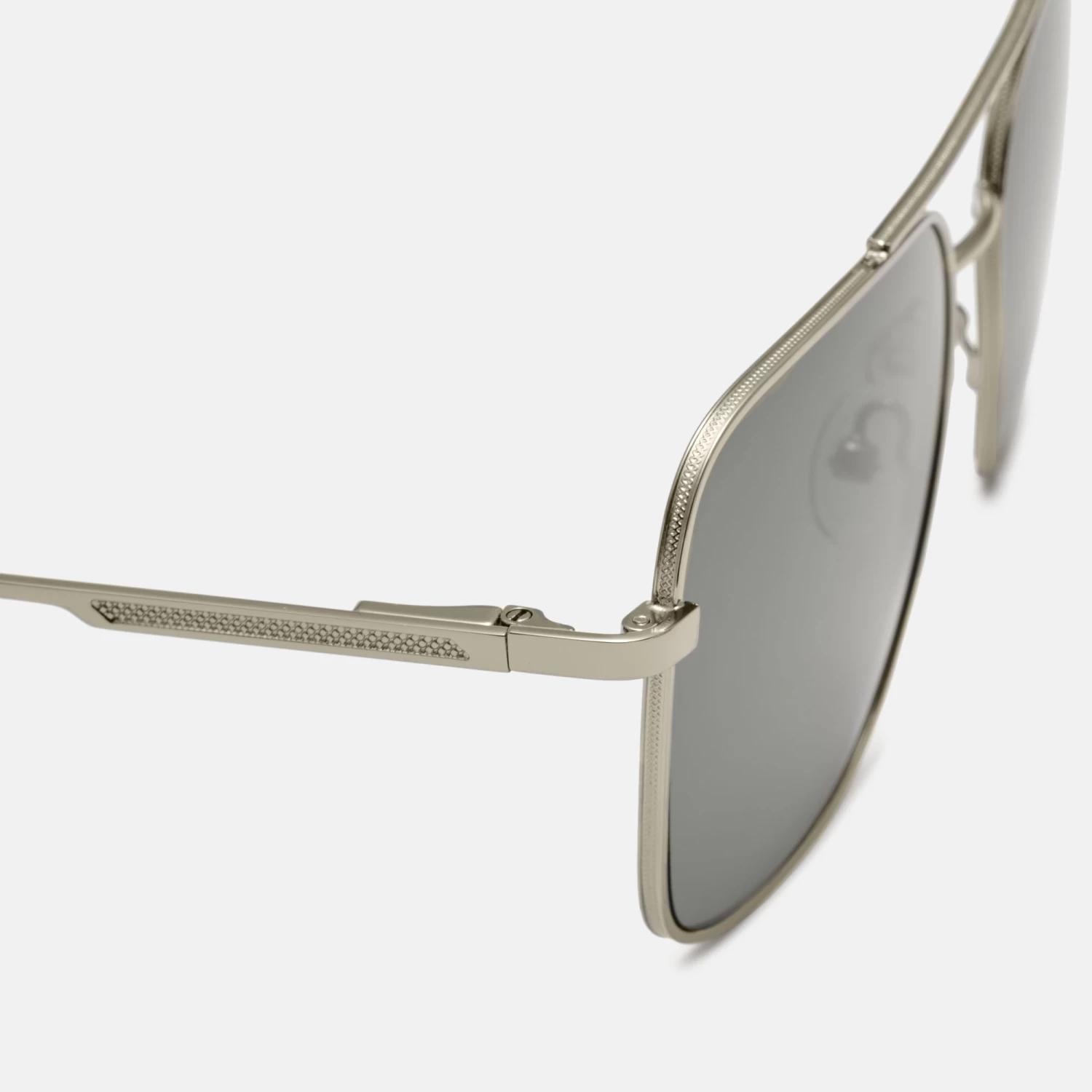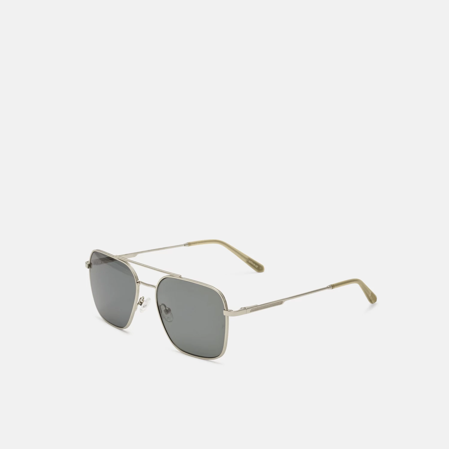 Gafas de sol para hombre, con forma aviador, de metal plateado. La varilla cuenta con relieve texturizado, que aporta un toque más sofisticado. Sus lentes grises de alta calidad, son polarizadas para una mayor protección y confort.