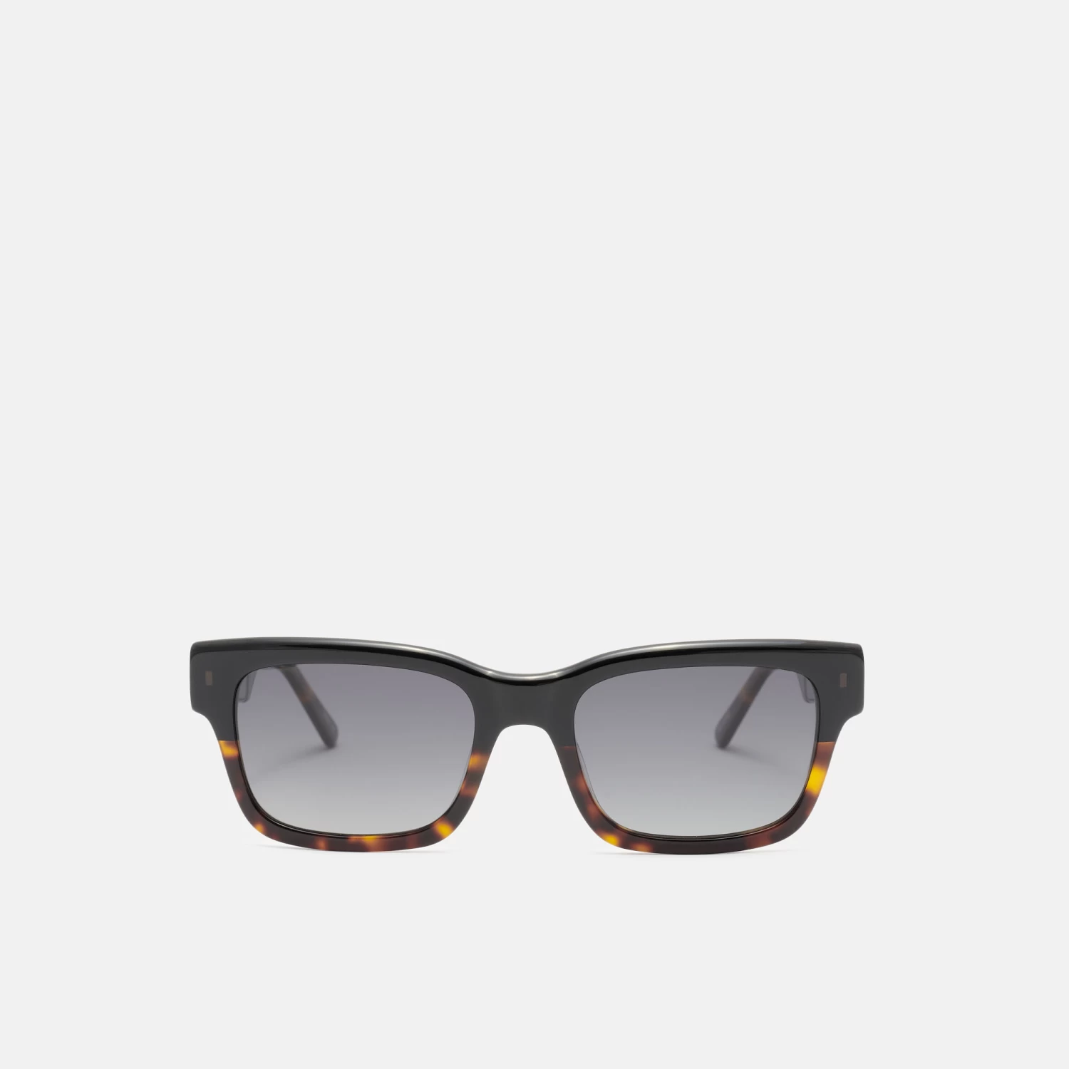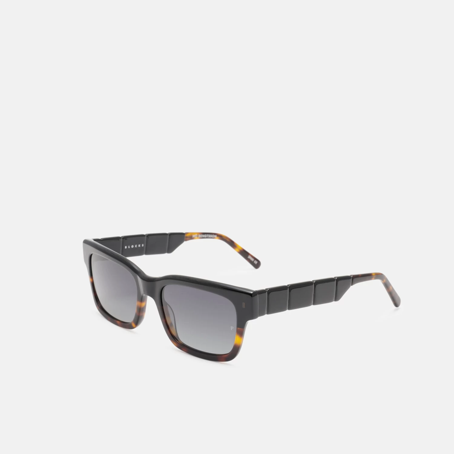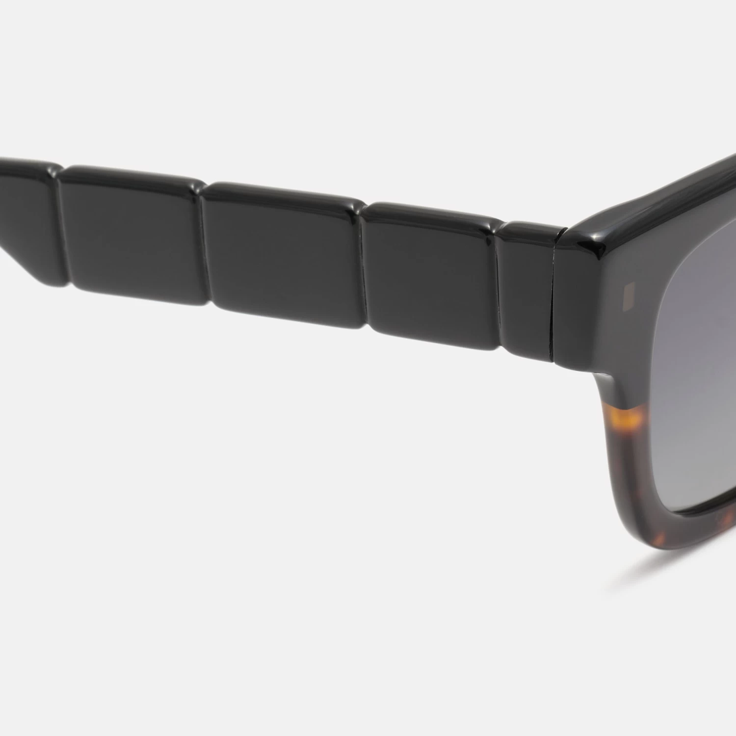 El modelo Mó Bengtsson de la colección BLOCKS inspirada en la geométrica colorida con origen en el grupo artístico Memphis. Hecha en acetato, diseño en forma rectangular con frontal y varilla en bicolor negro y carey. Sus lentes grises degradadas de alta calidad, son polarizadas para una mayor protección y confort. Estas gafas son un complemento original y atrevido para completar cualquier look.