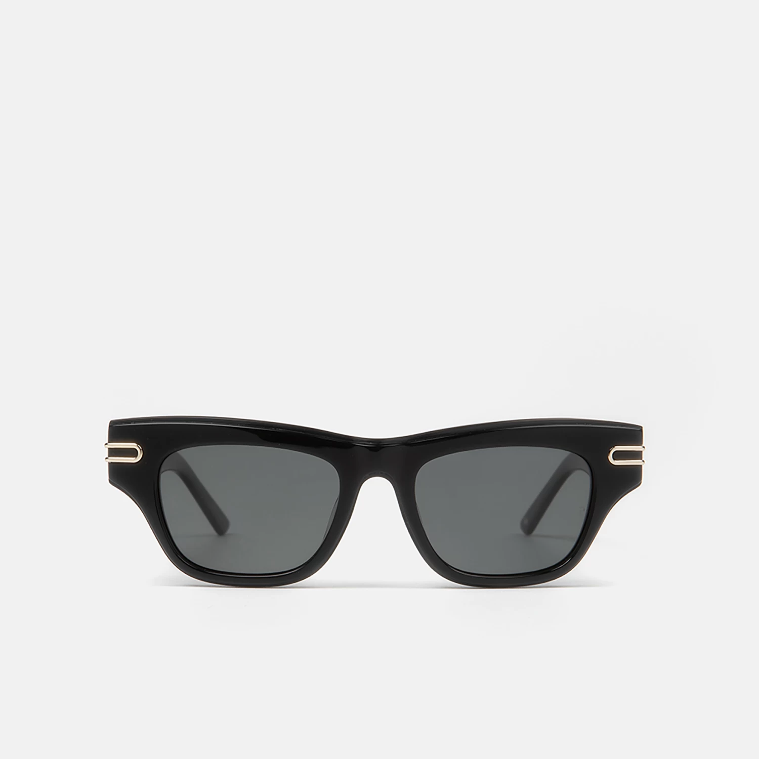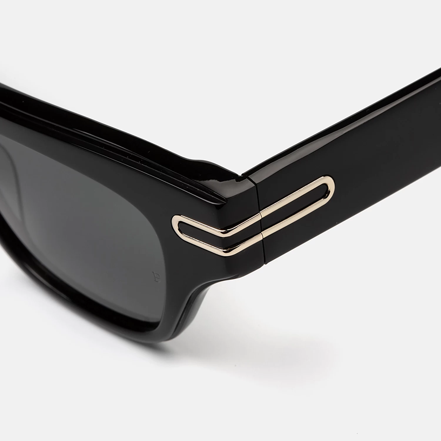 Gafas de sol para mujer, con forma «cat-eye», de acetato negro con varilla adornada con detalle metálico dorado. Sus lentes grises de alta calidad son polarizadas, para una mejor protección y confort.