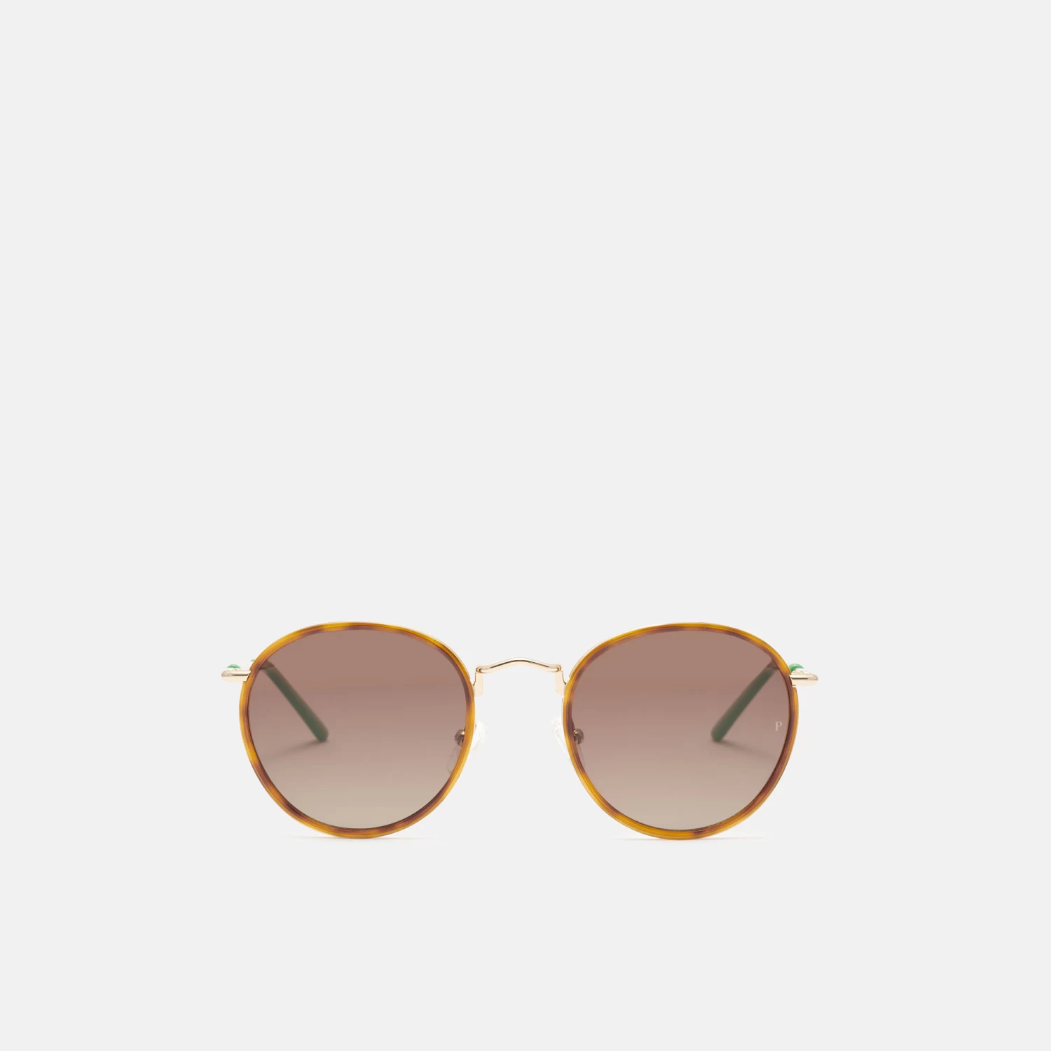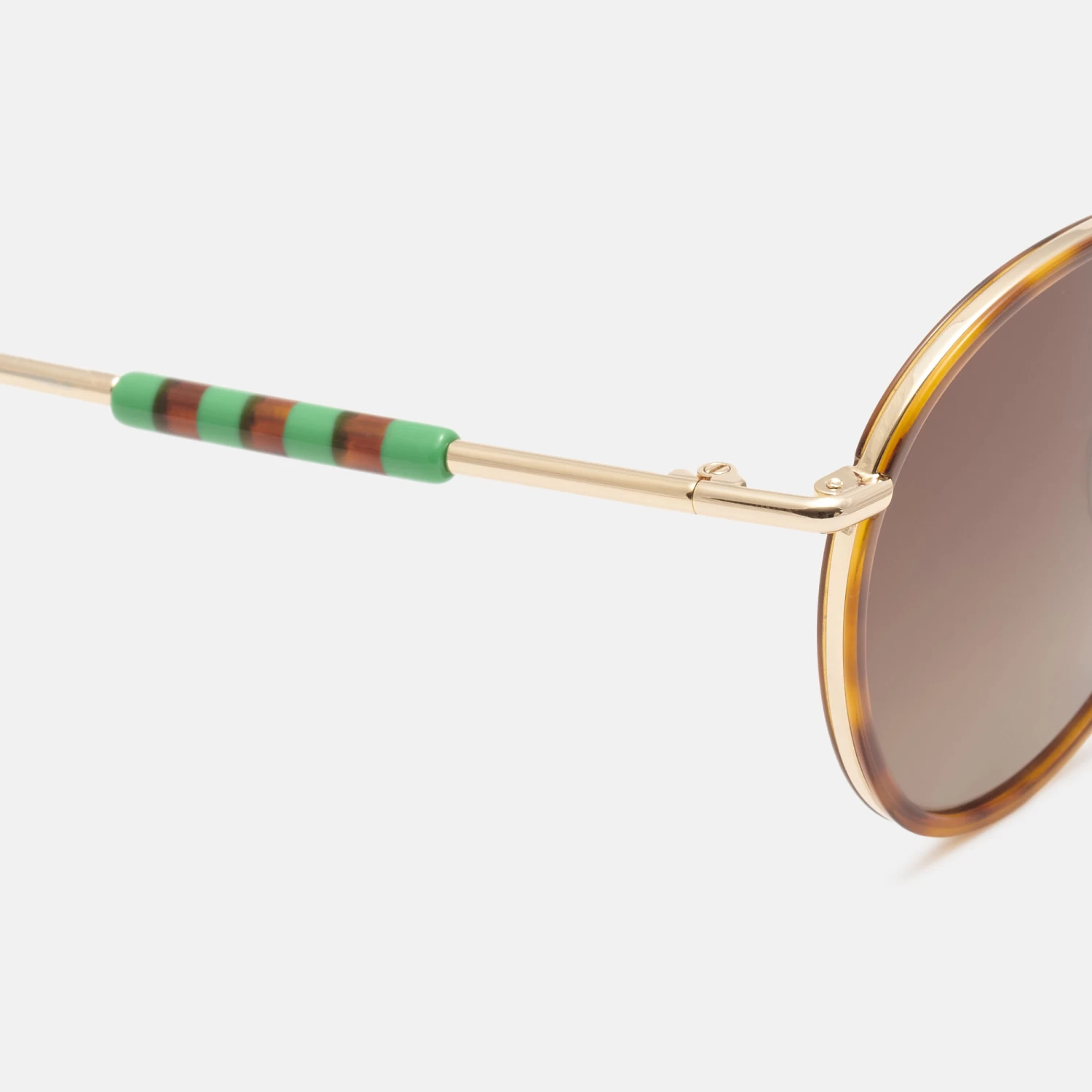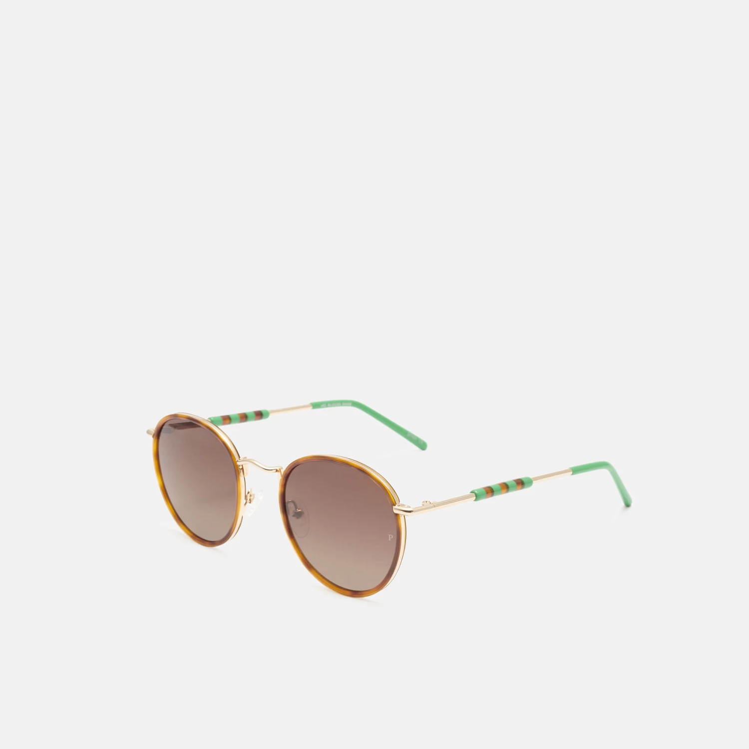 El modelo Mó BLOCKS Shike de la colección BLOCKS inspirada en la geométrica colorida con origen en el grupo artístico Memphis. Un clásico que hemos querido reversionar. Diseño fabricación mixta con silueta redonda y metal dorado. En carey, con varilla bicolor verde y carey. Sus lentes marrones degradadas de alta calidad, son polarizadas para una mayor protección y confort.