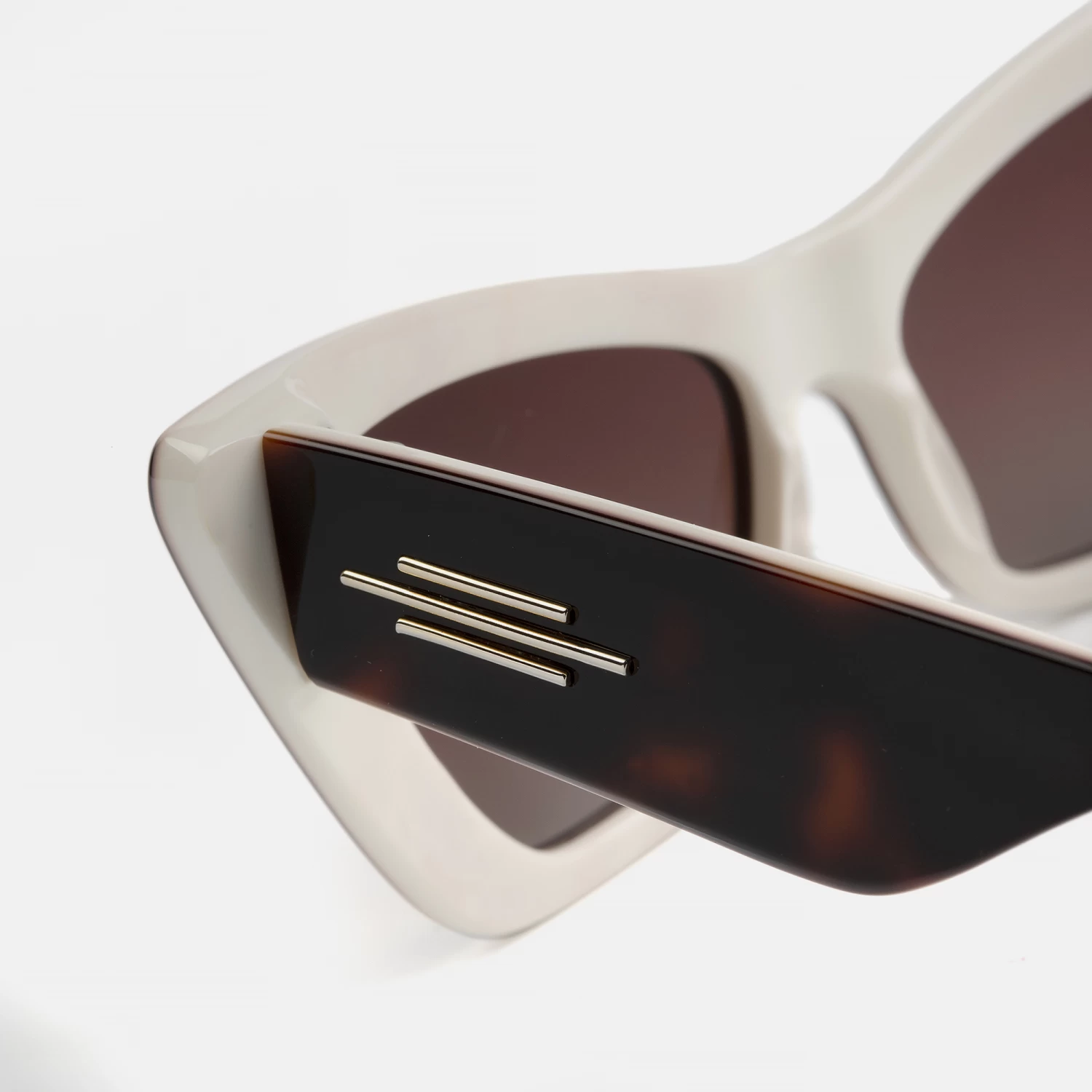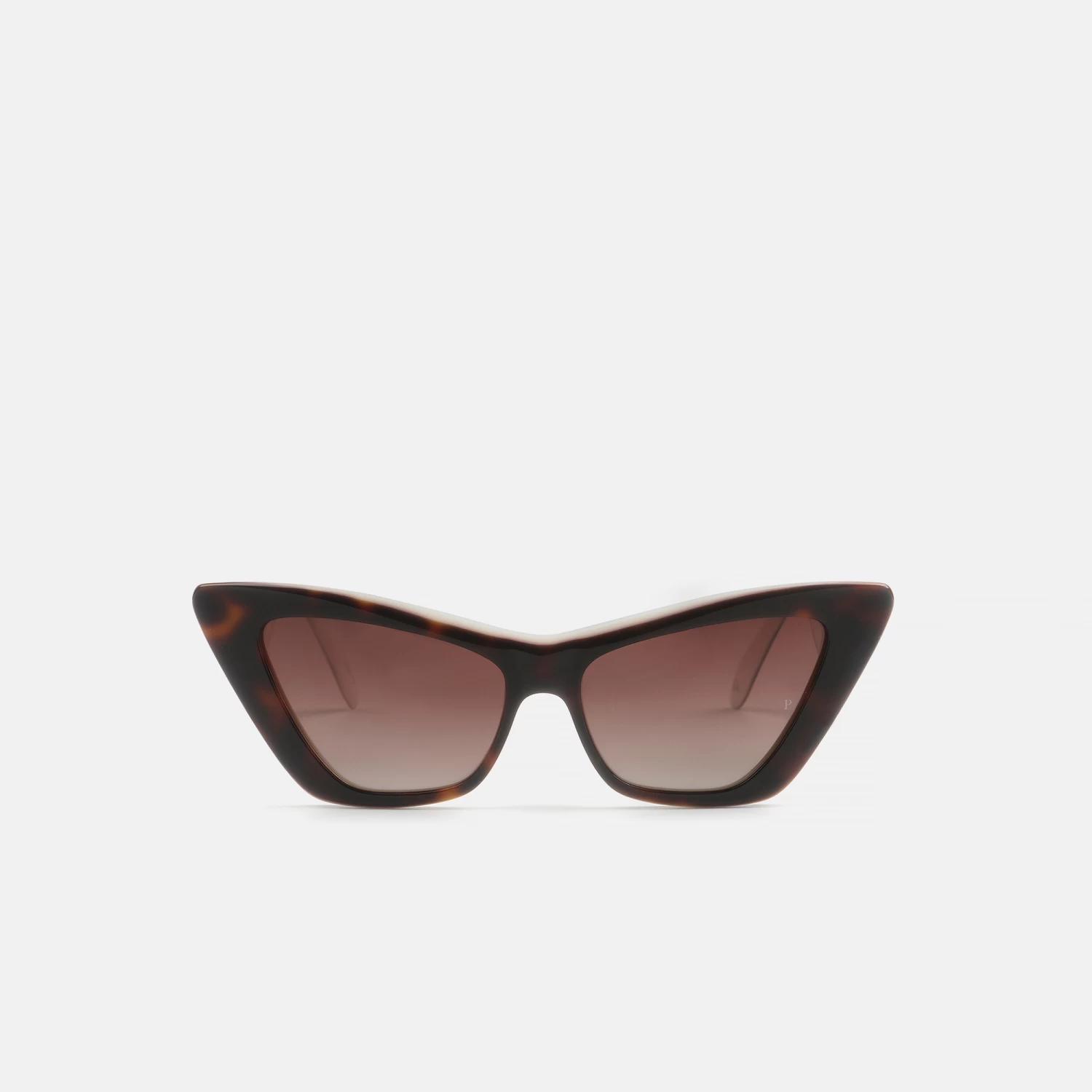 Gafa de sol de mujer, con forma cat-eye muy marcada, como en los años 50 y 60, de acetato carey, cuenta con laminaciones y slope down en el frente y varillas. En la varilla destaca el detalle metal deco con relieve, que eleva la gafa y da personalidad a la montura. Con lente degradada para una mirada más sofisticada. Sus lentes polarizadas proporcionan una visión más nítida y un mejor contraste. Una gafa rompedora con aire vintage.