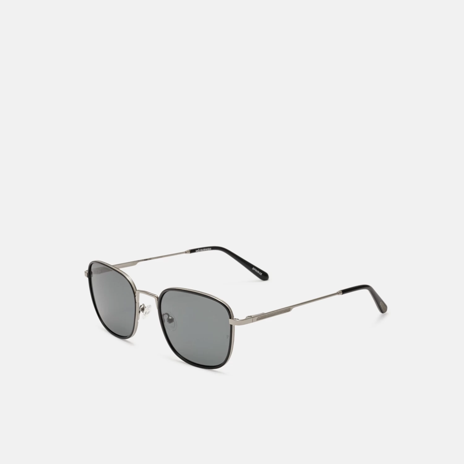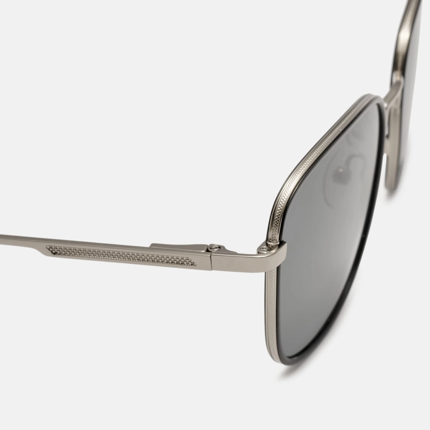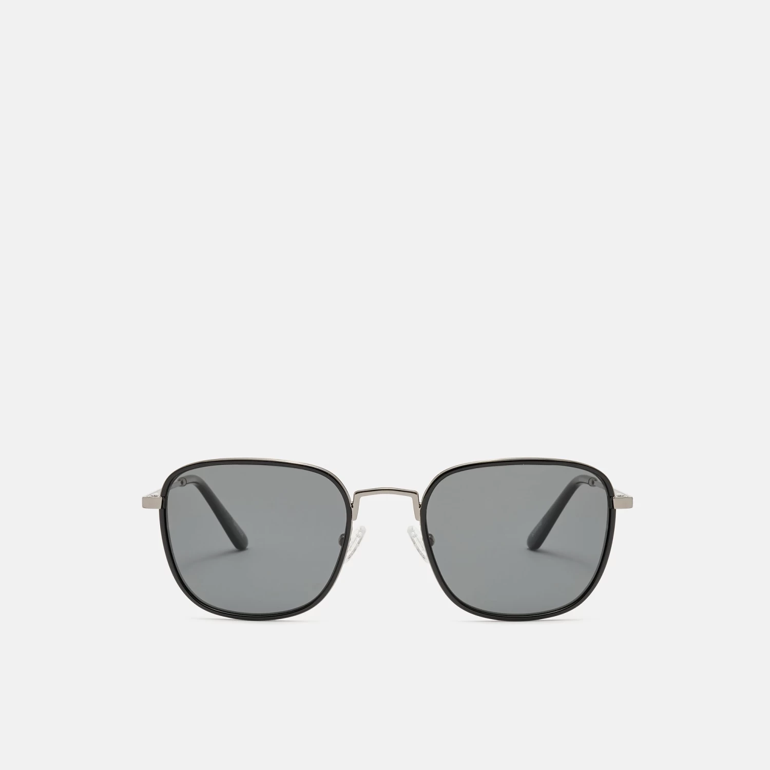 Gafas de sol para hombre, con forma cuadrada, de metal con aros de acetato en color negro. La varilla cuenta con relieve texturizado, que aporta un toque más sofisticado. Sus lentes grises de alta calidad, son polarizadas para una mayor protección y confort.