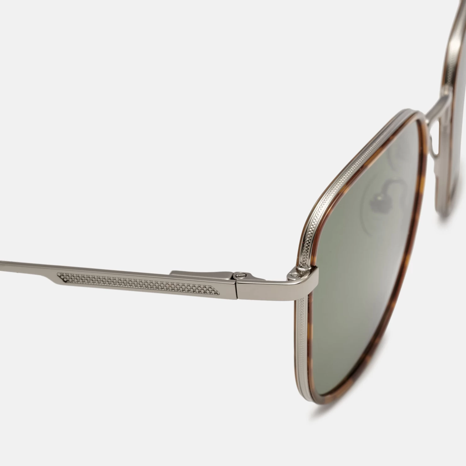 Gafas de sol para hombre, con forma cuadrada, de metal con aros de acetato en color carey. La varilla cuenta con relieve texturizado, que aporta un toque más sofisticado. Sus lentes verdes de alta calidad, son polarizadas para una mayor protección y confort.