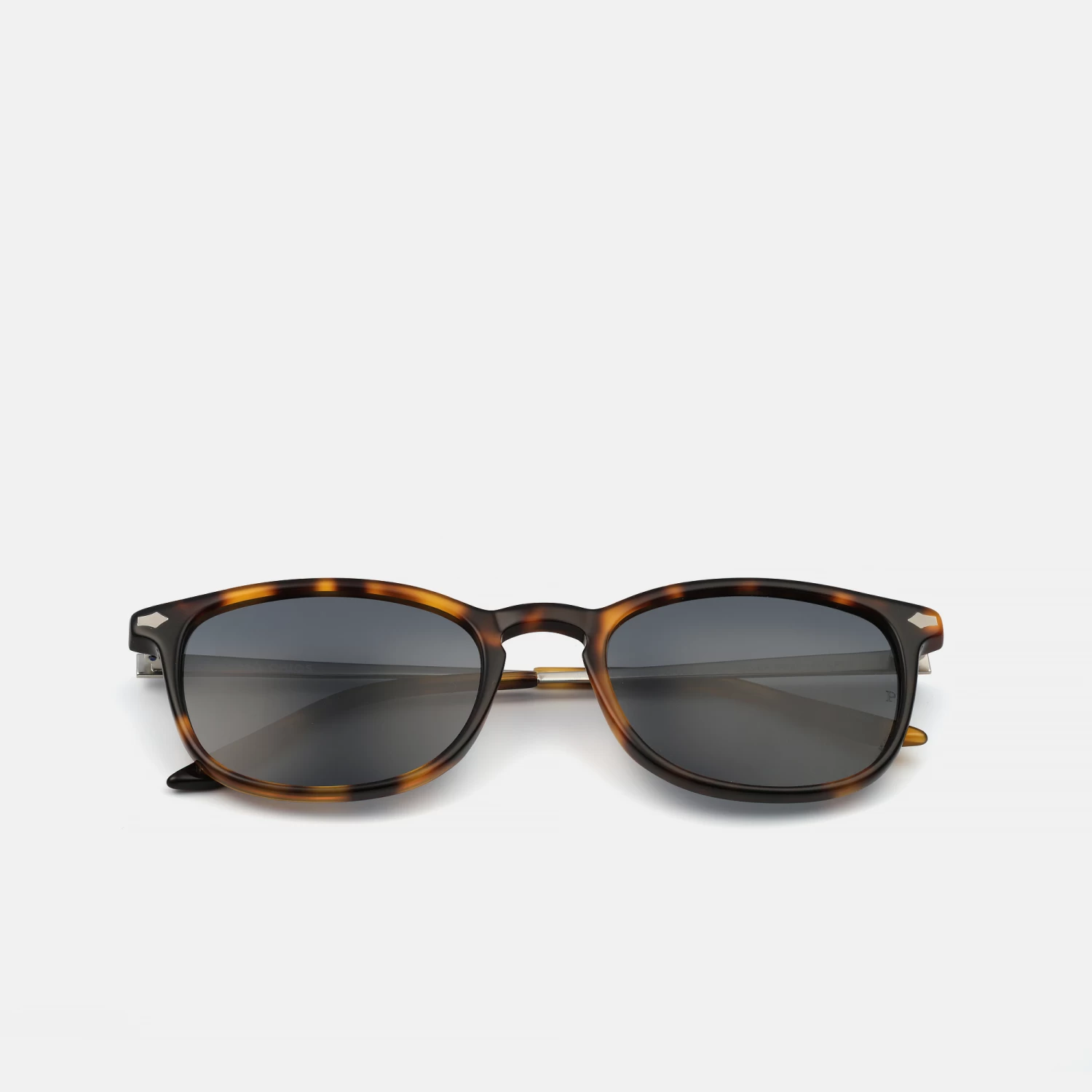 Gafas de estilo unisex de forma geométrica en acetato de color carey y varilla de metal color plateado. Con lentes color gris polarizadas.