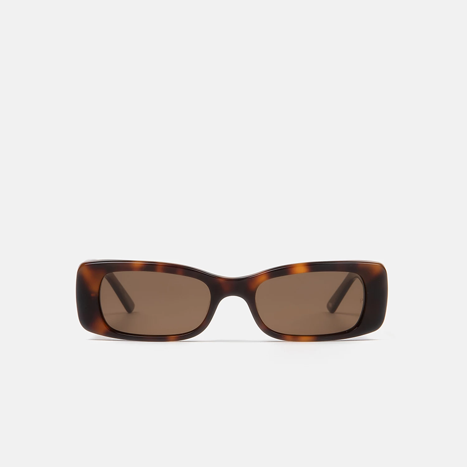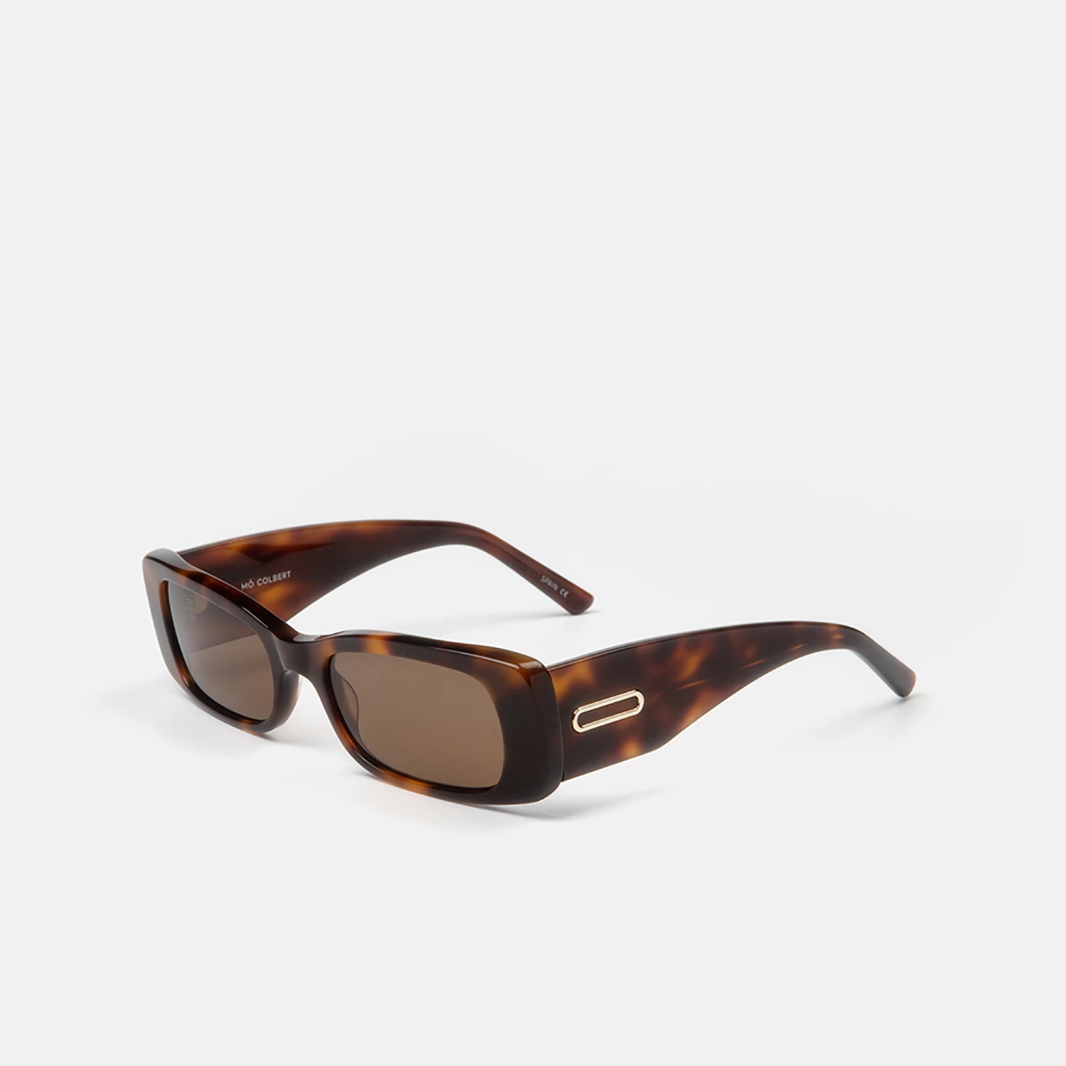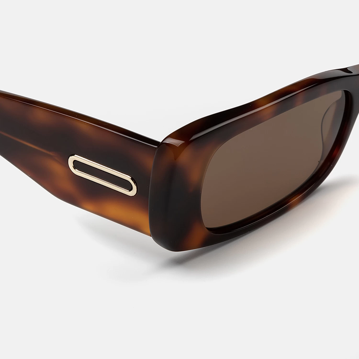 Gafas de sol para mujer, con forma rectangular minimalista, de acetato carey con varilla ancha adornada con detalle metálico dorado. Sus lentes marrones de alta calidad son polarizadas, para una mejor protección y confort.