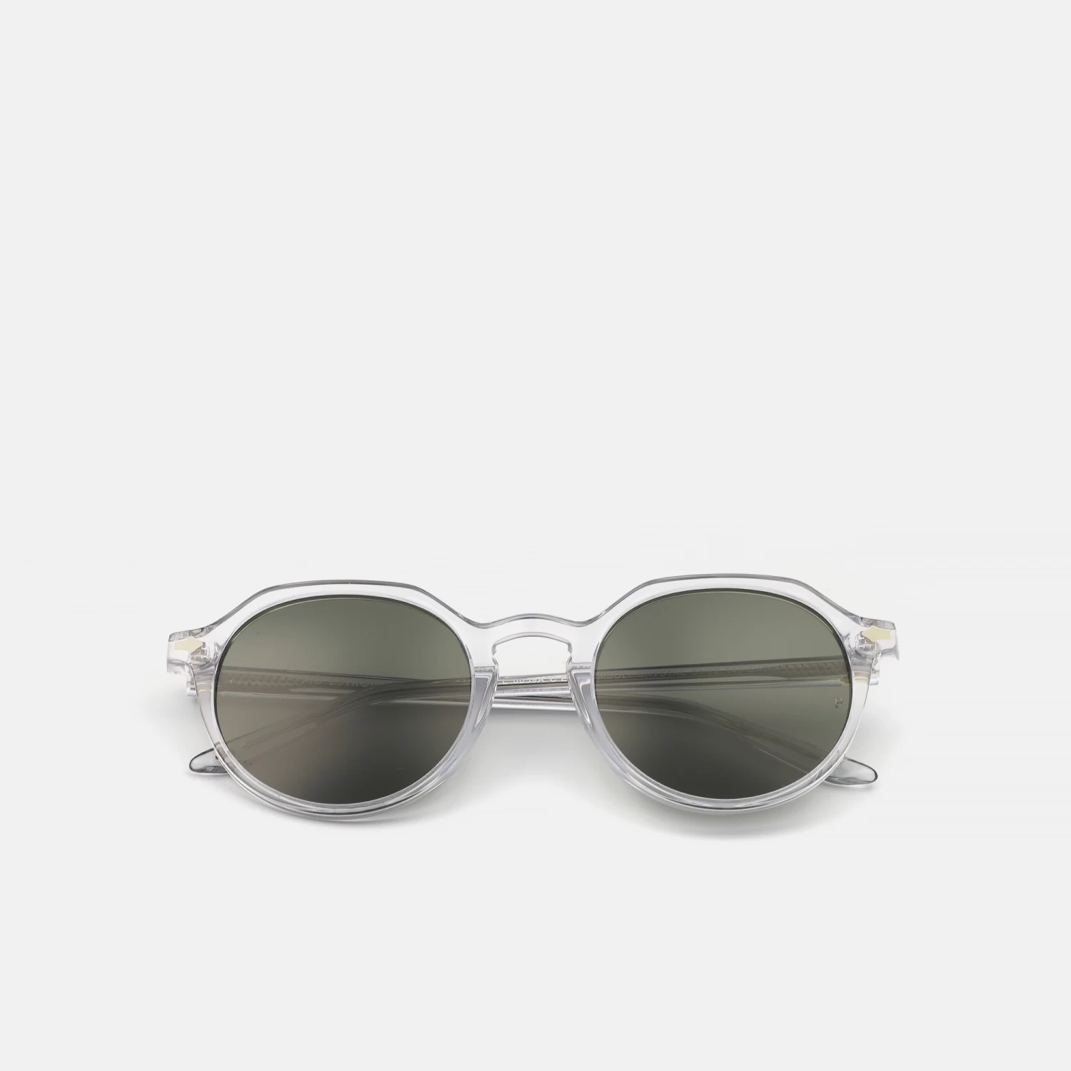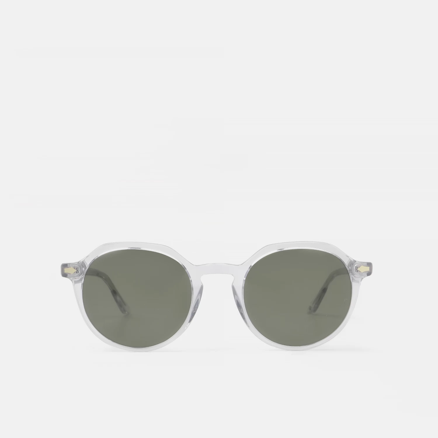Gafas de estilo unisex de forma geométrica en acetato de color cristal, incluye detalle de color dorado en frente y varilla. Con lentes color verde polarizadas.