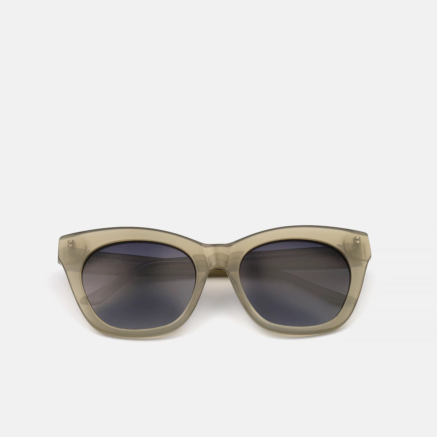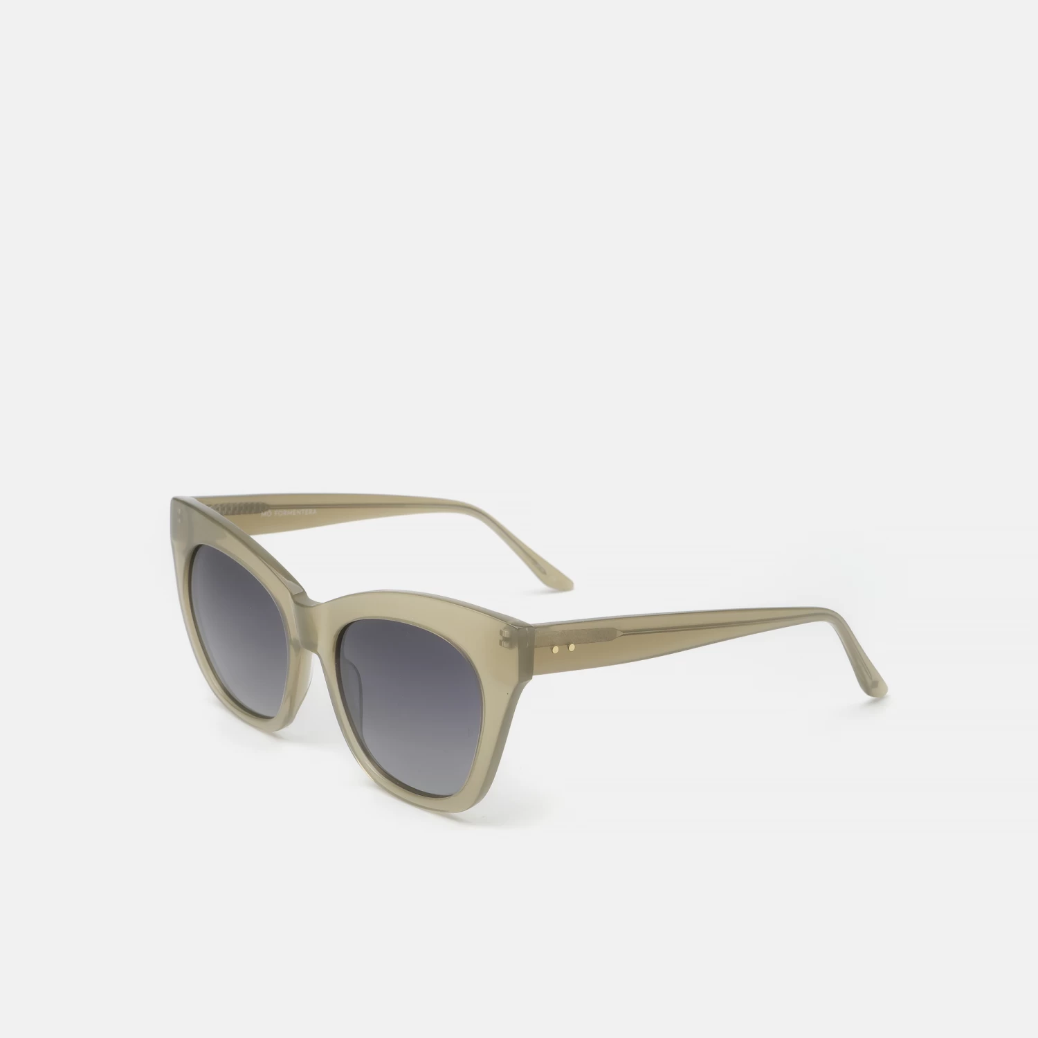 Gafas para mujer de estilo cat-eye en acetato color khaki, incluye detalles metálicos en la varilla de color dorado. Lentes de color gris degradadas polarizadas.