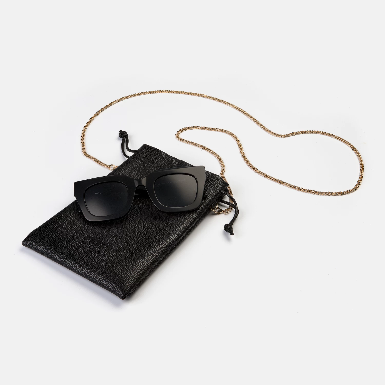 Las gafas de esta exclusiva colección van acompañadas del complemento perfecto, un bolsito de piel sintética que incluye una cadena metálica dorada y una gamuza exclusivamente diseñada que va a juego con toda la imagen de la cápsula.