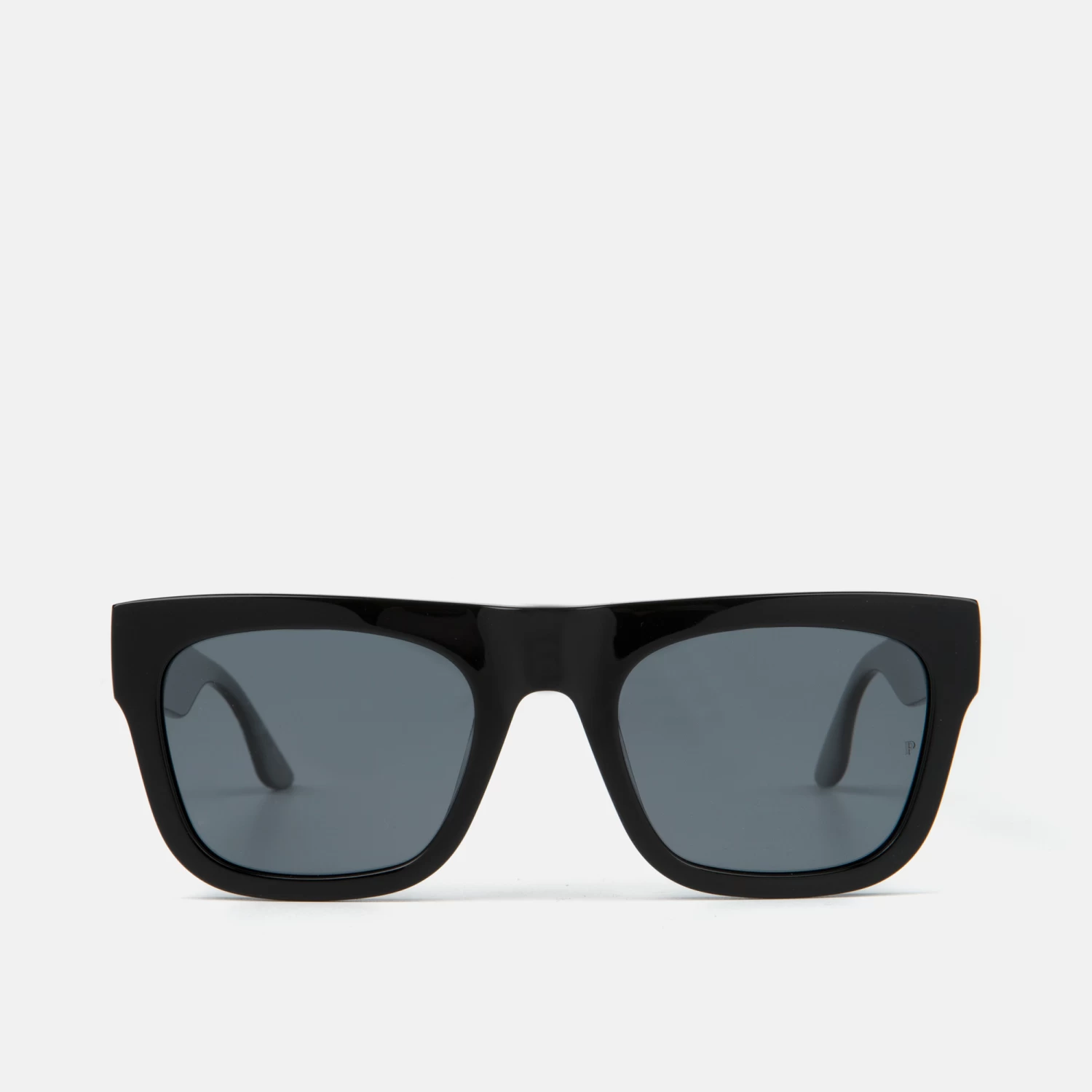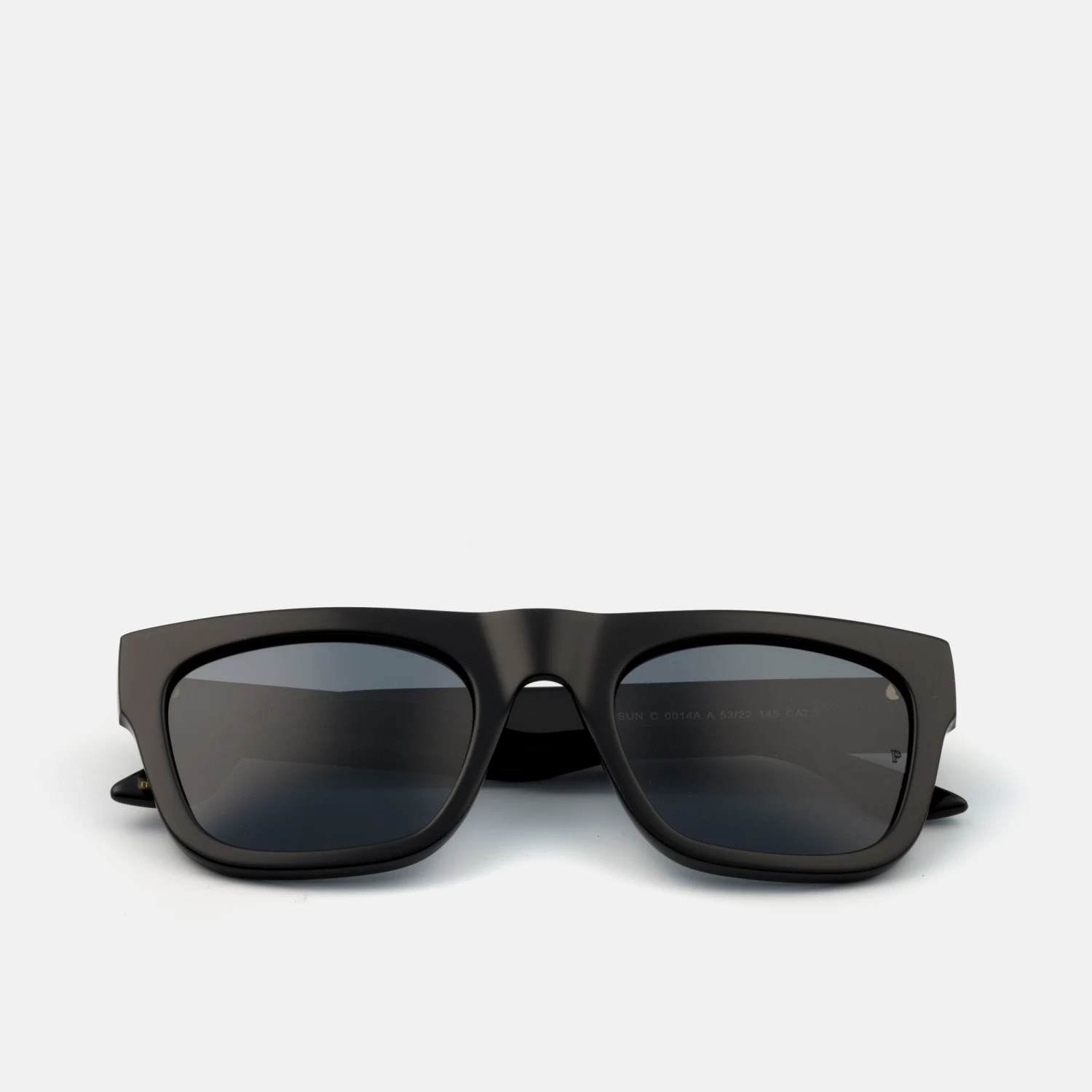 Gafas de sol moda de acetato negro, con silueta rectangular y perfil ancho. Sus lentes son grises polarizadas. Pertenecen a nuestra cápsula FRONT ROW.
