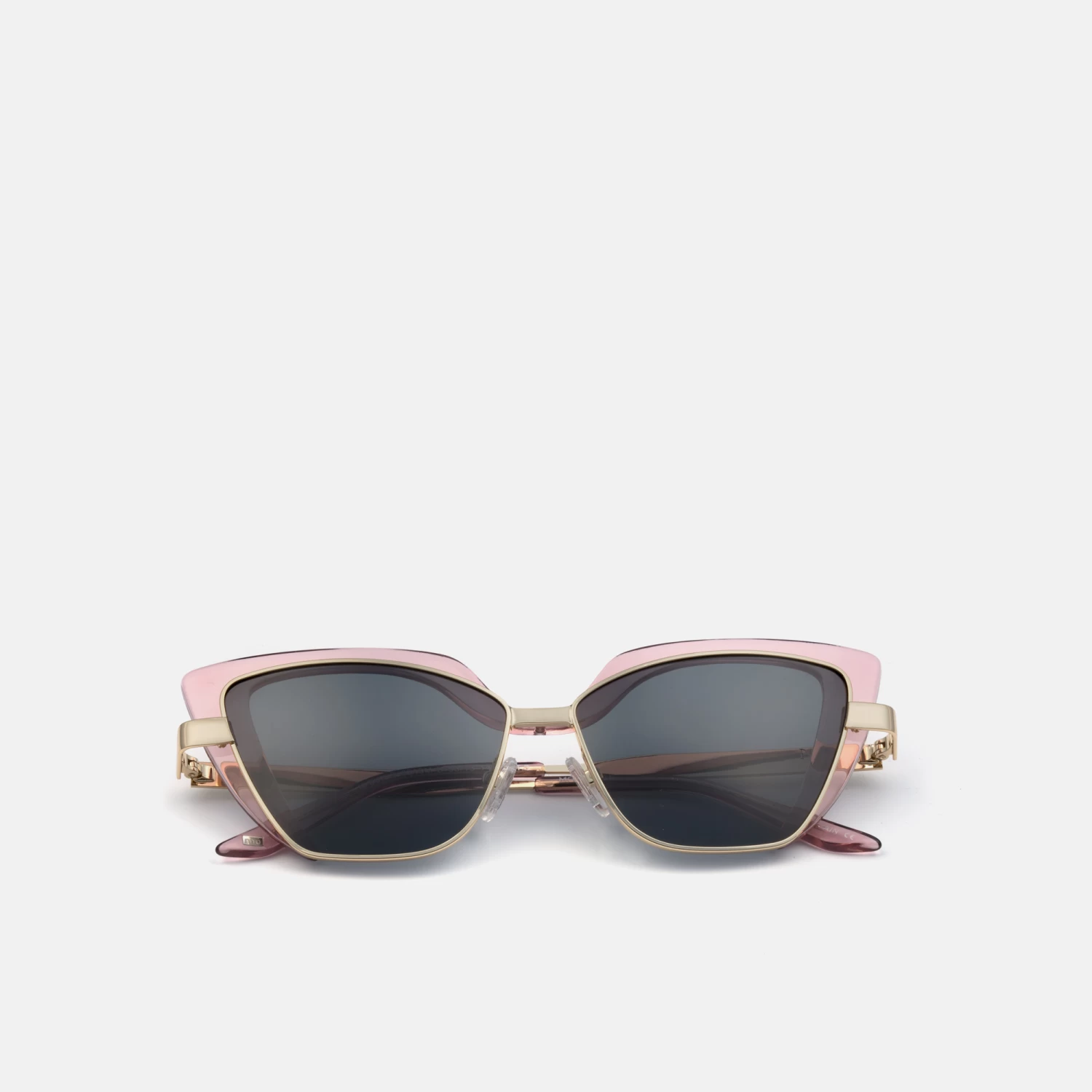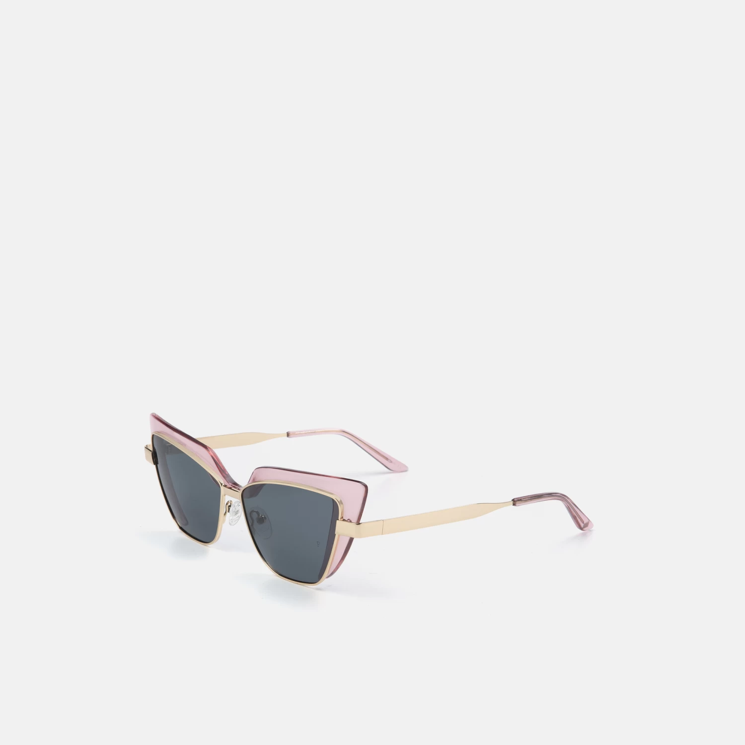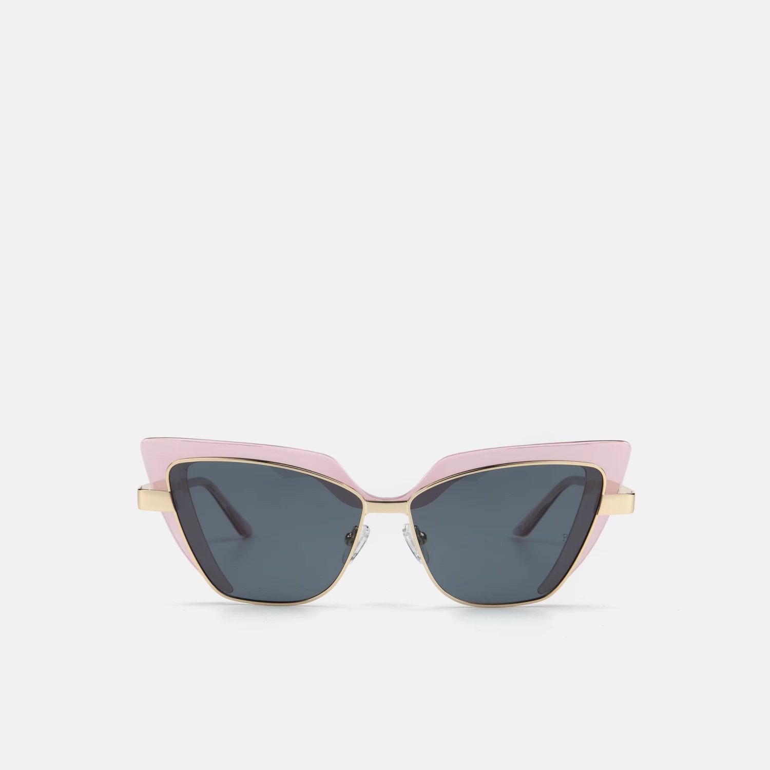Gafas de sol de silueta cat-eye extremo, formadas por una estructura metálica en color dorado y una lámina de acetato rosa crystal.