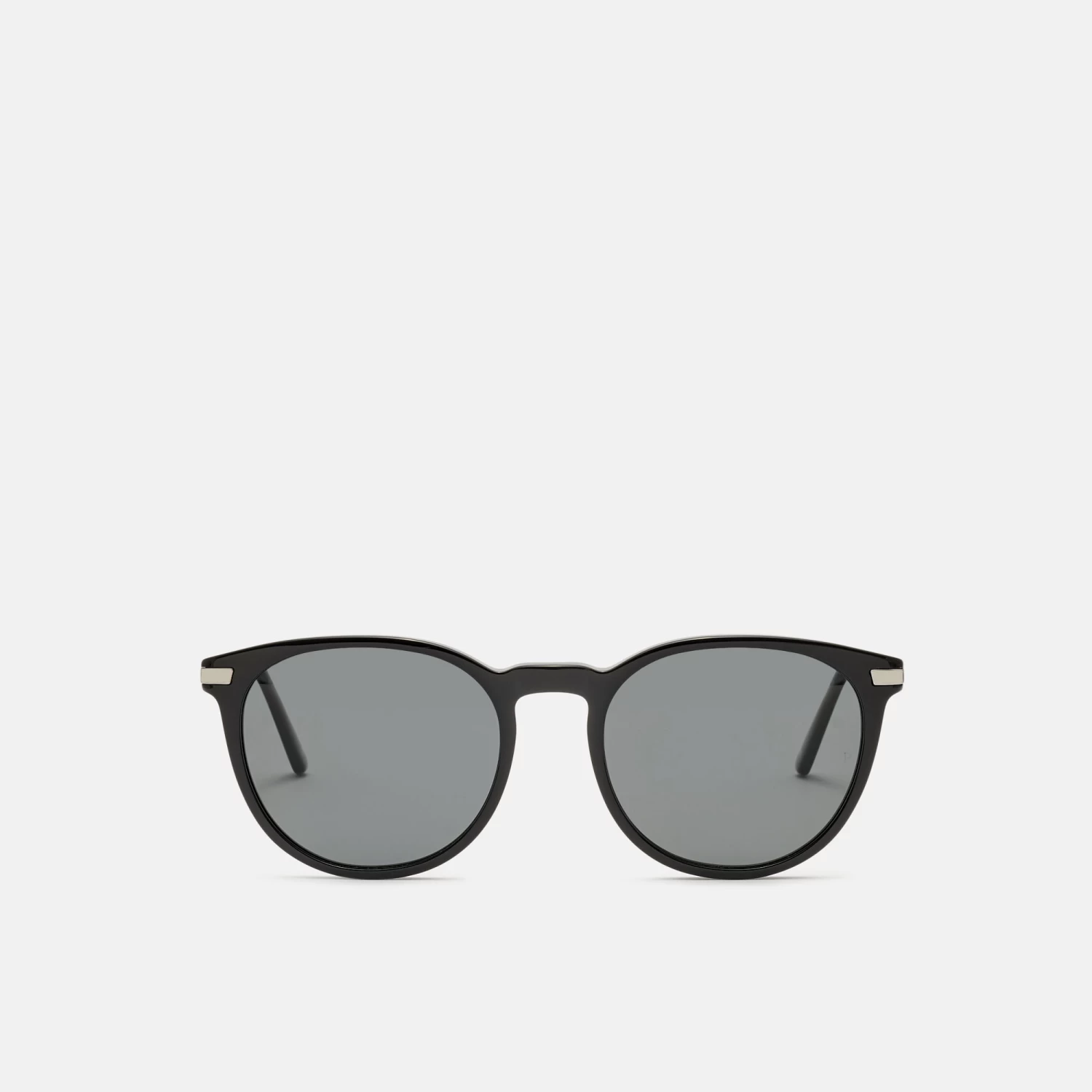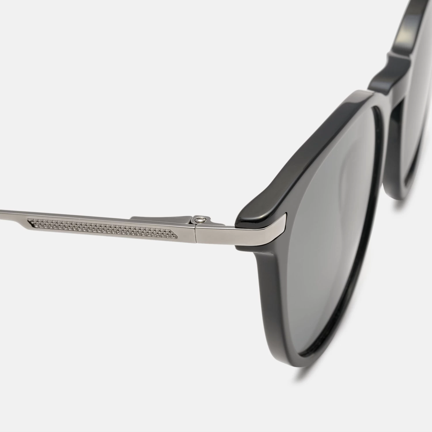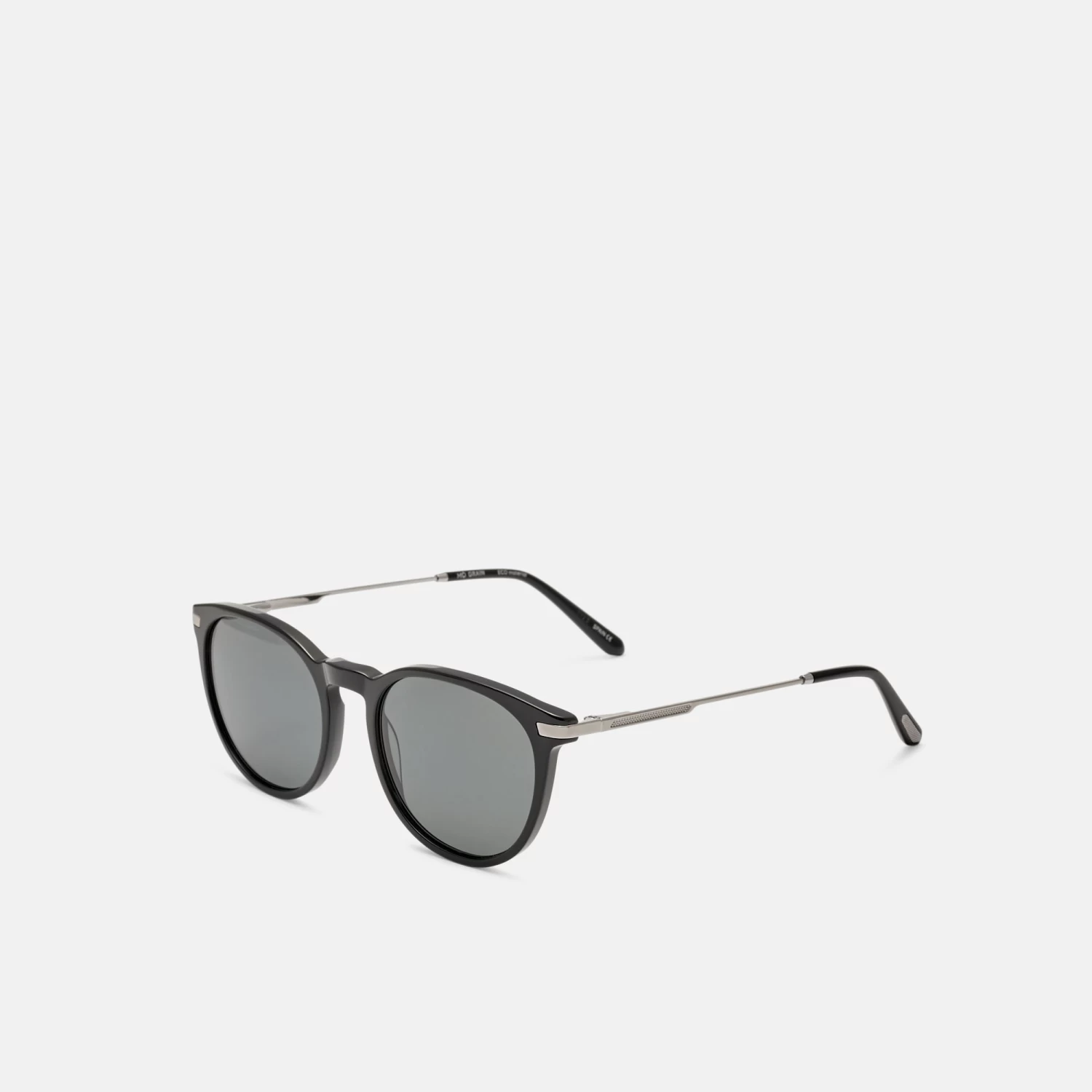 Gafas de sol para hombre, con forma redonda, de acetato negro. La varilla de metal cuenta con relieve texturizado, que aporta un toque más sofisticado. Sus lentes grises de alta calidad, son polarizadas para una mayor protección y confort.