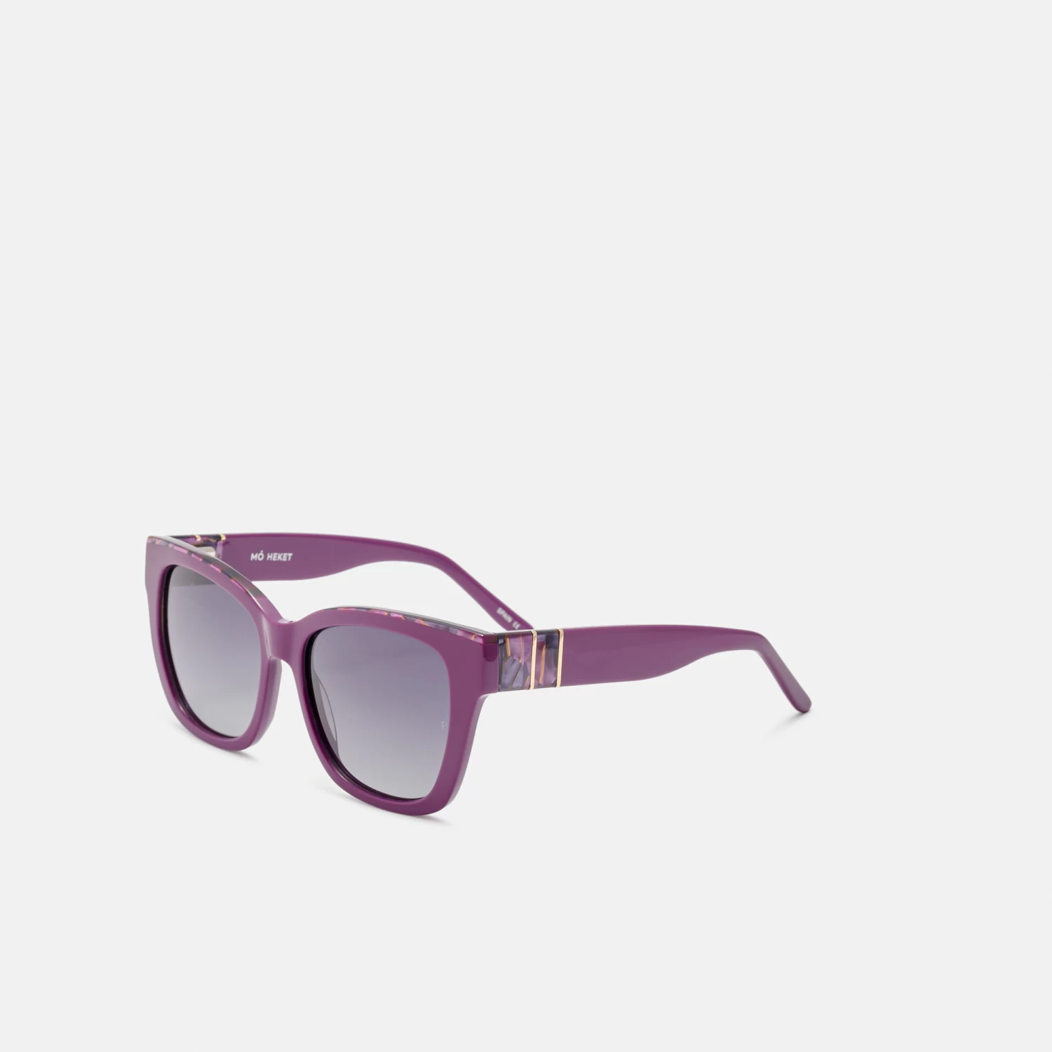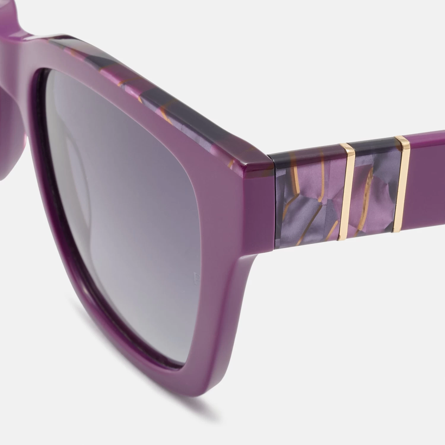 Gafas de sol para mujer, con forma cuadrada, en acetato morado con contrastes de acetato marmolado en los bordes frontales y en las varillas, y decoradas con detalles metálicos dorados.