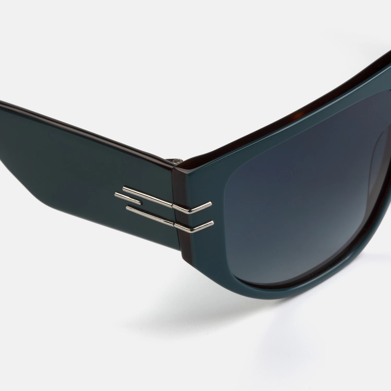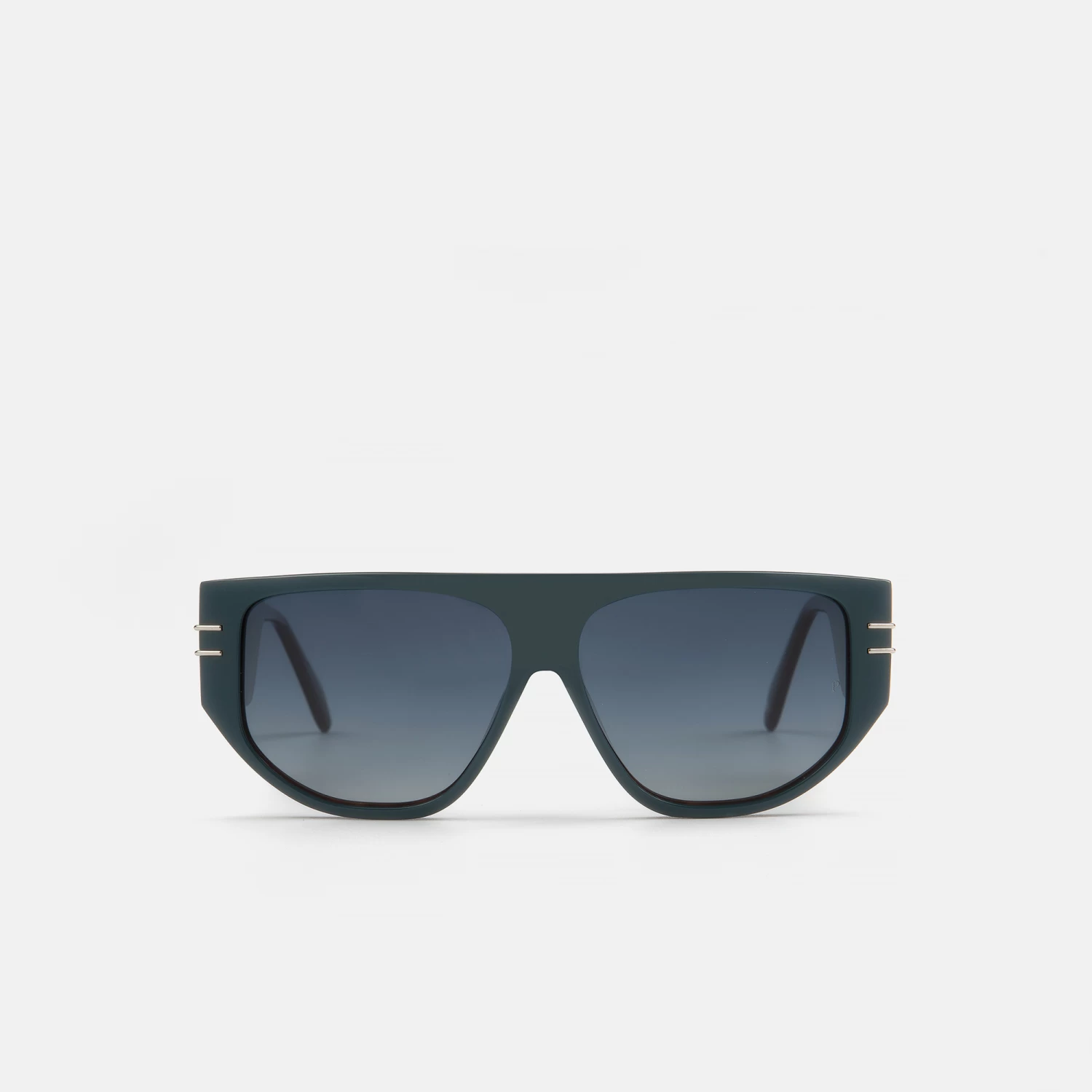 Gafa de sol unisex, con forma de pantalla retro, de acetato verde, cuenta con detalles metálicos en relieve, que elevan la gafa y dan personalidad. Con lente degradada para una mirada más sofisticada. Sus lentes polarizadas proporcionan una visión más nítida y un mejor contraste.
