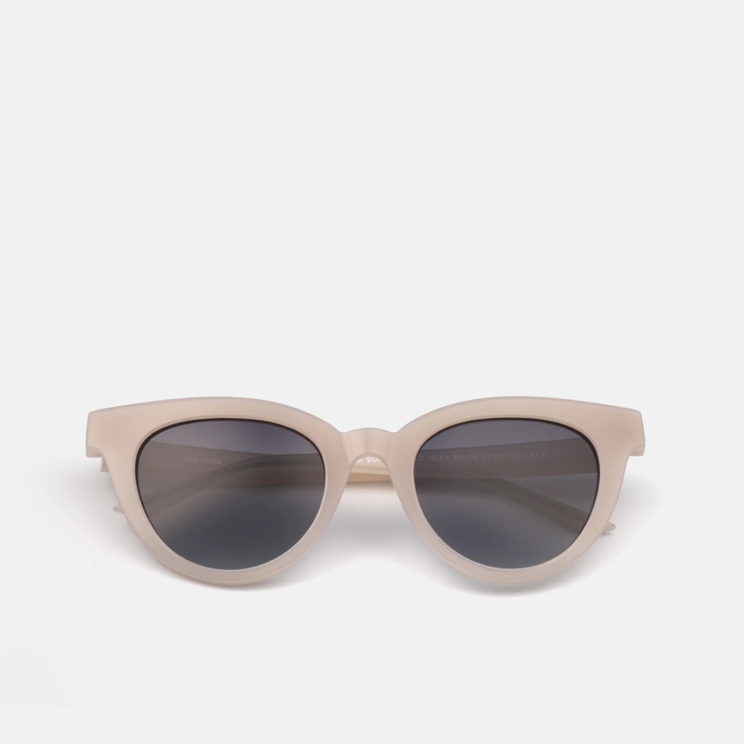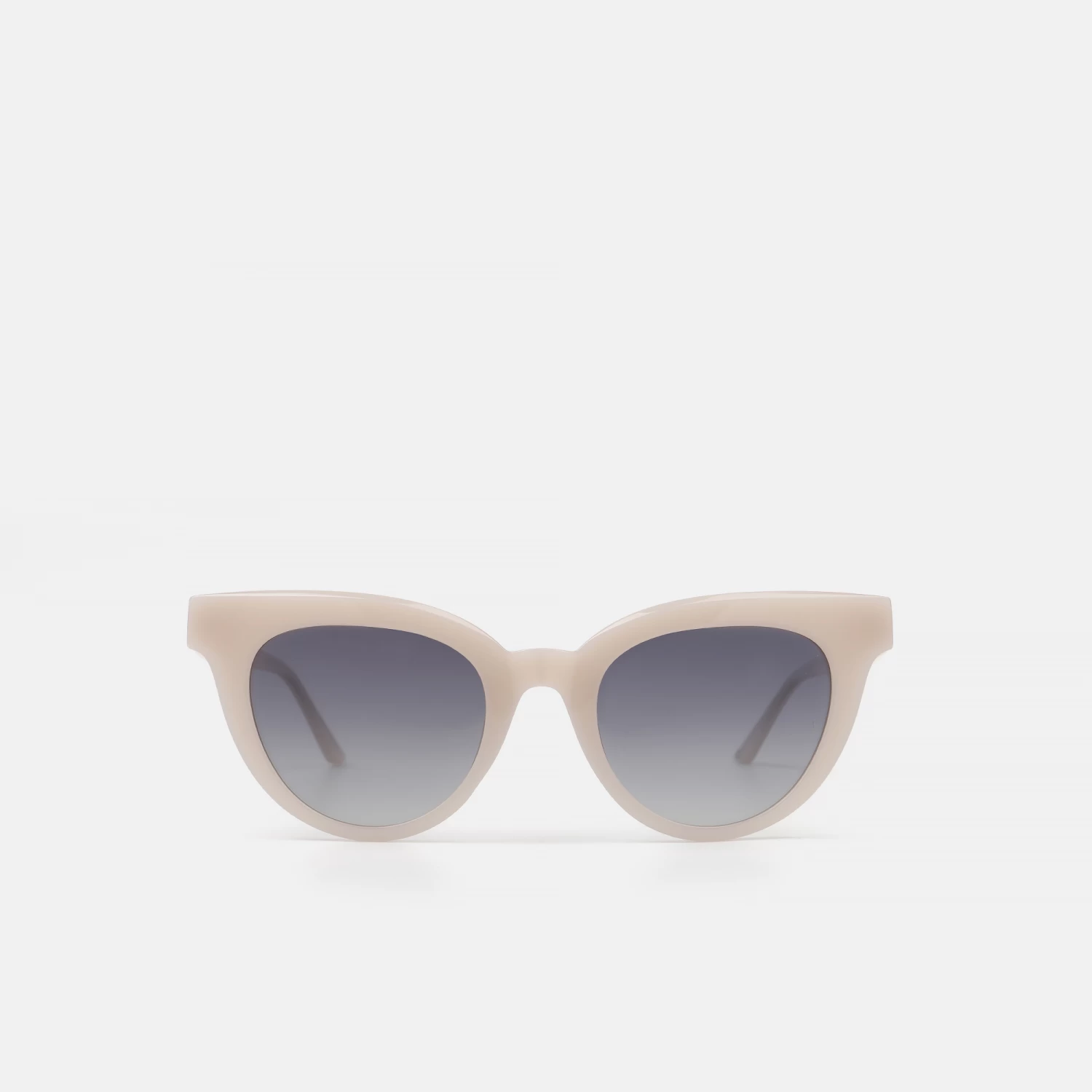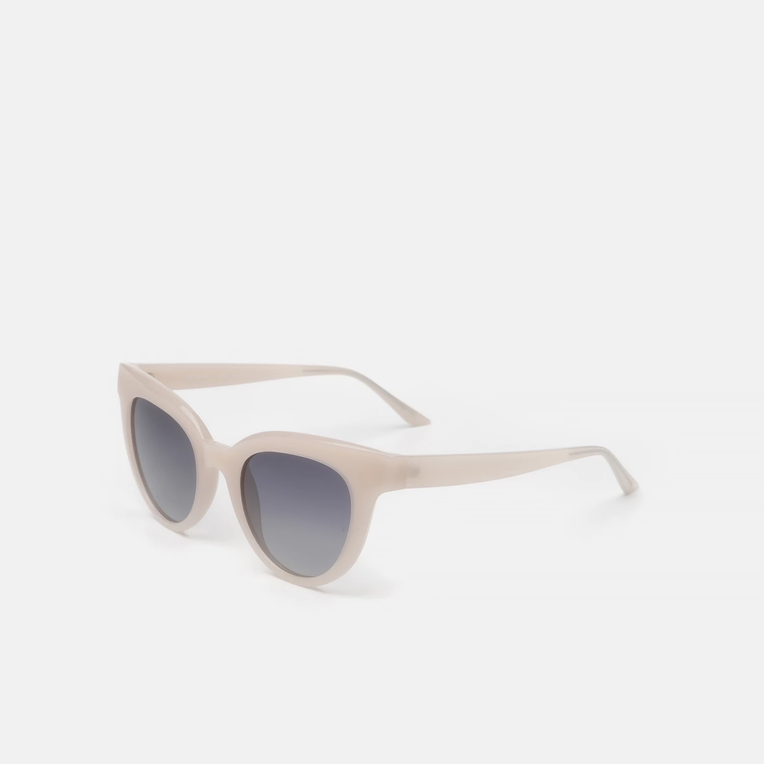Gafas para mujer de estilo cat-eye en acetato inyectado color beige, con lentes de color gris polarizadas.