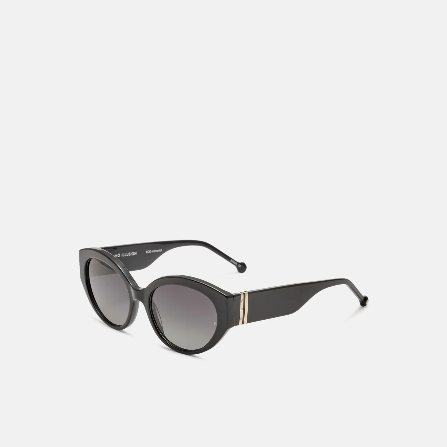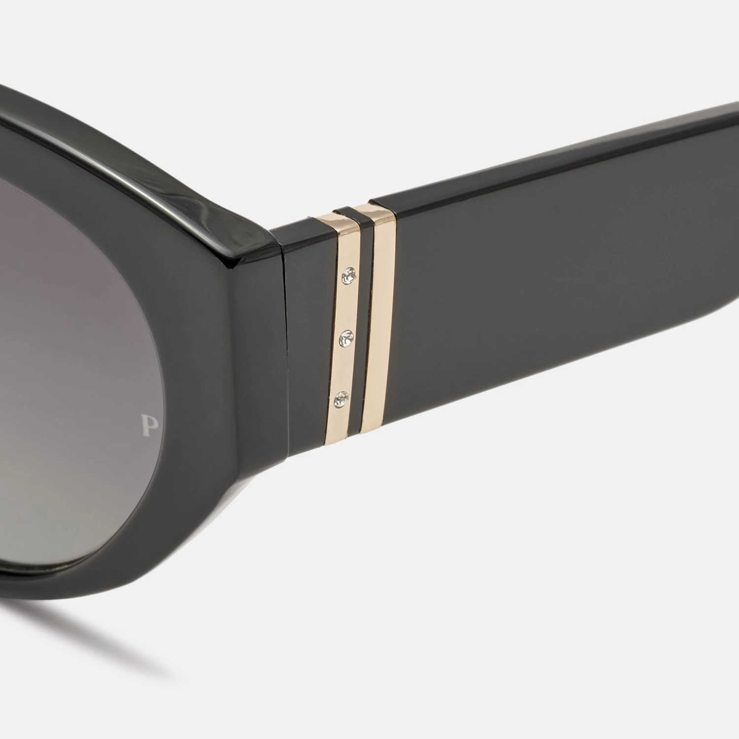Gafas de sol para mujer, con forma «cat-eye» relajada, en acetato negro. El frente y varilla cuentan con piezas metálicas en relieve y brillo, que aportan un toque más sofisticado. Sus lentes grises degradadas de alta calidad, son polarizadas para una mayor protección y confort.