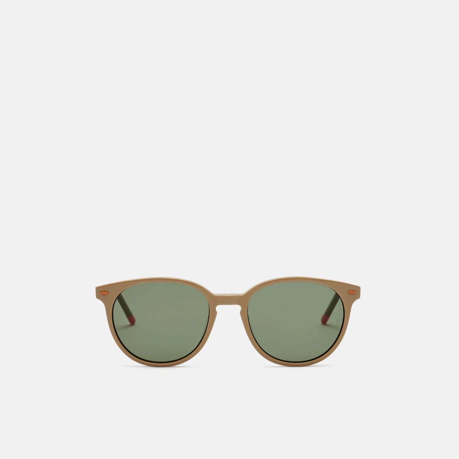 Gafas de sol unisex, con silueta redonda, de acetato beige, con detalles de color naranja tanto en frente como en varillas. Sus lentes verdes son polarizadas de alta calidad, para una mejor protección y confort