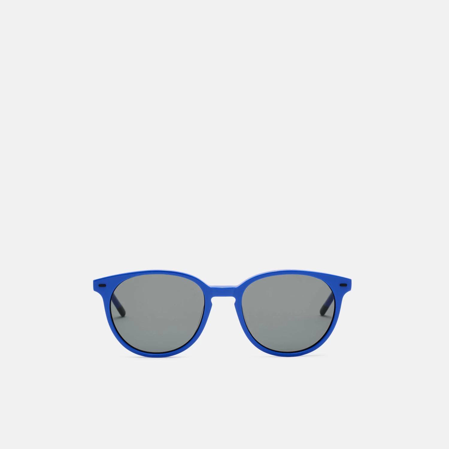 Gafas de sol unisex, con silueta redonda, de acetato azul eléctrico, con detalles de color negro tanto en frente como en varillas. Sus lentes grises son polarizadas de alta calidad , para una mejor protección y confort.