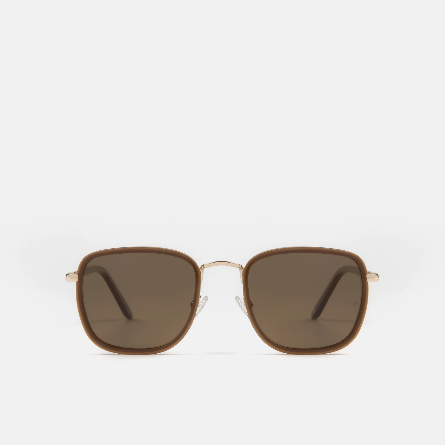 El modelo MÓ Korcu de forma cuadrada con ligera geometría es una gafa sofisticada y elegante. Diseñada con combinación de metal y acetato para elevar tus looks. En metal dorado y acetato color marrón.