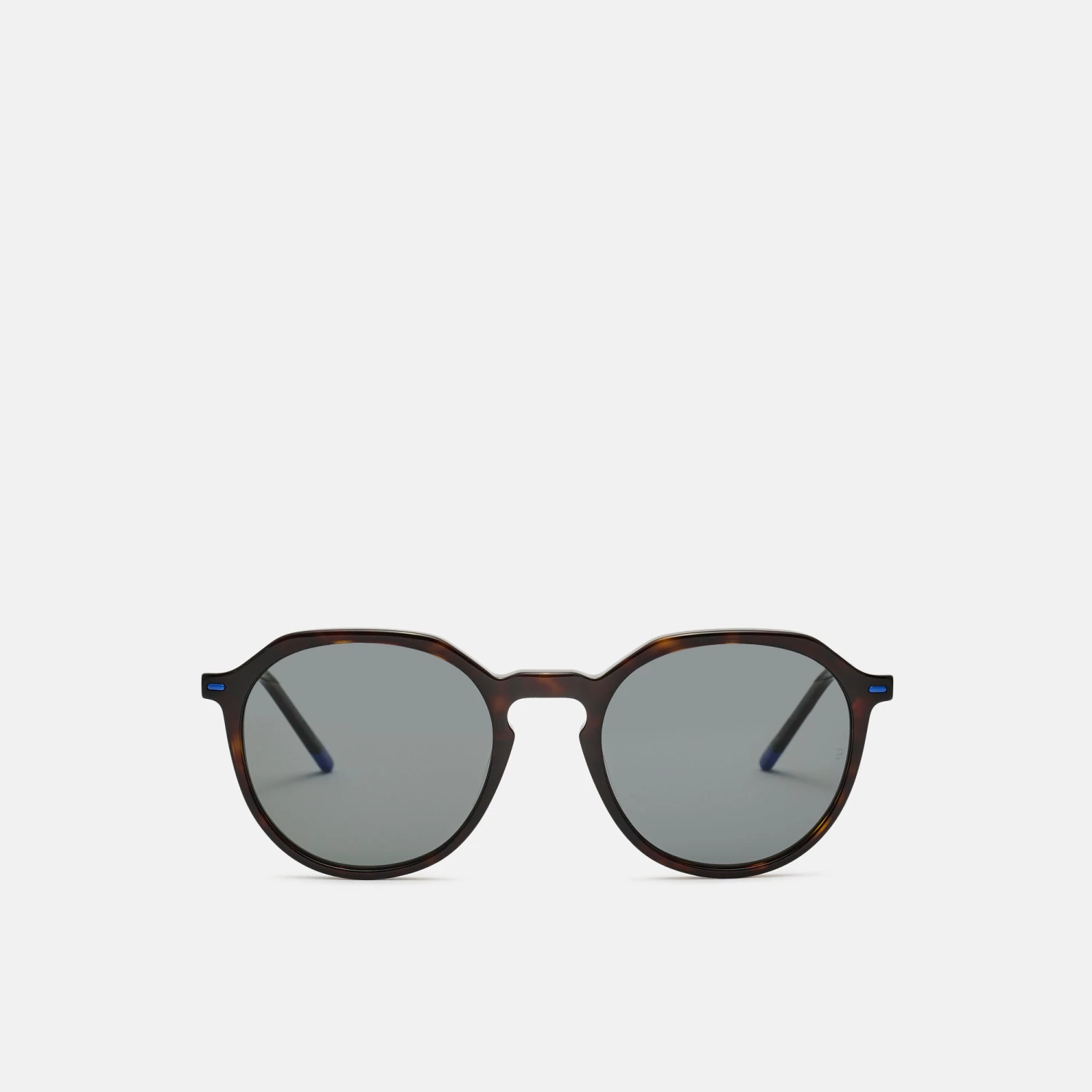 Gafas de sol unisex, con silueta geométrica, de acetato carey, con detalles de color azul eléctrico tanto en frente como en varillas. Sus lentes grises son polarizadas de alta calidad, para una mejor protección y confort .