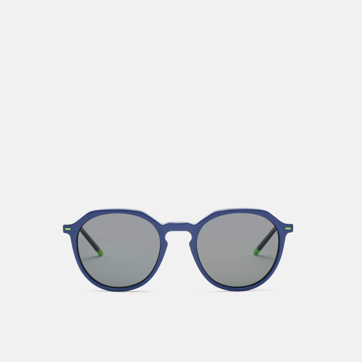 Gafas de sol unisex, con silueta geométrica, de acetato azul, con detalles de color verde flúor tanto en frente como en varillas. Sus lentes grises son polarizadas de alta calidad , para una mejor protección y confort.