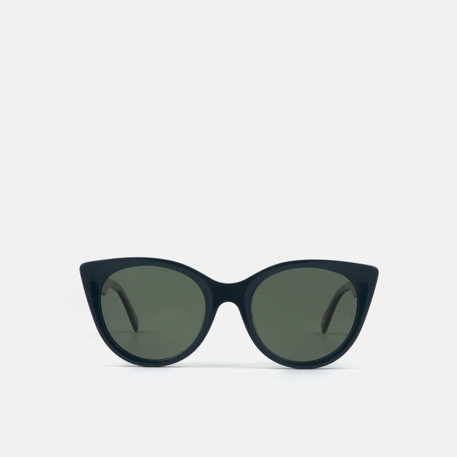Gafas para mujer, con forma cat-eye, fabricadas en acetato en color azul con lente verde polarizada.