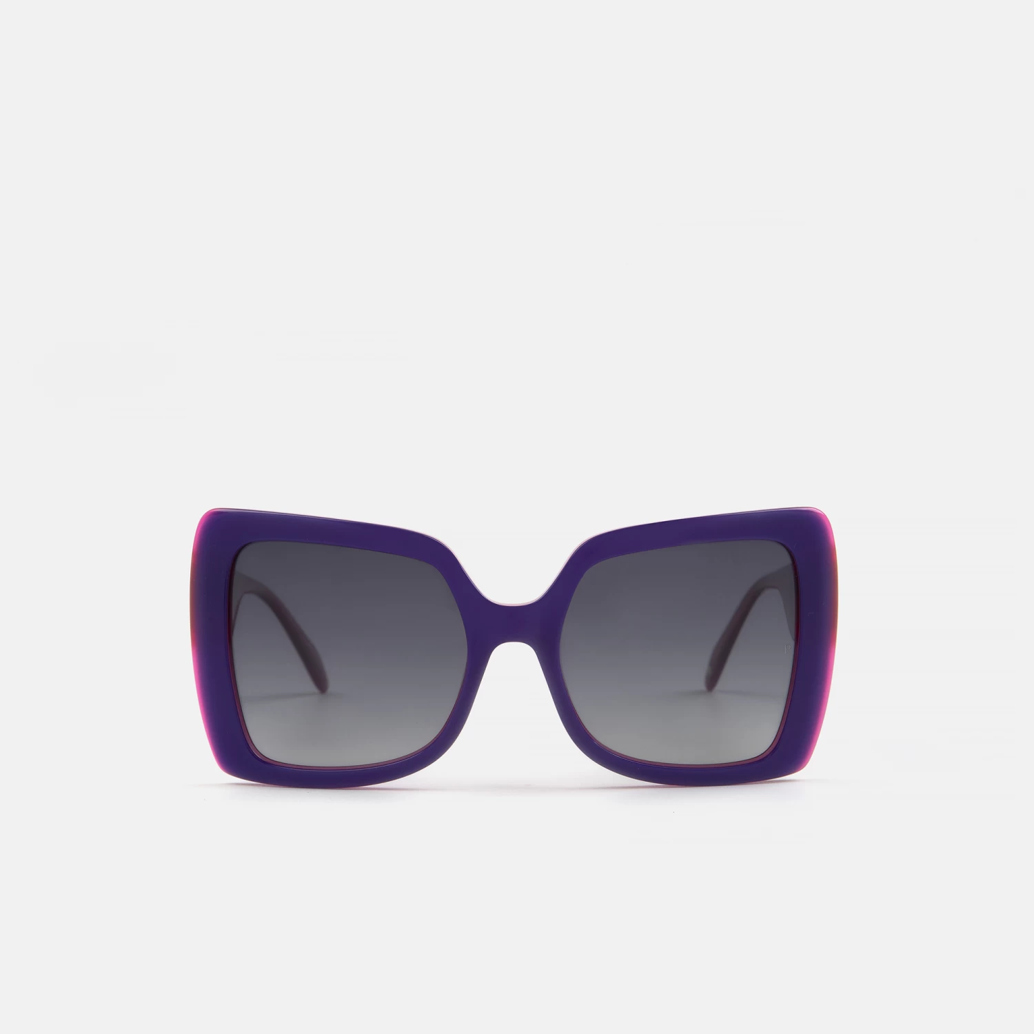 Gafa de sol de mujer, con forma retro oversize , de acetato morado, cuenta con laminaciones y slope down en el frente y varillas. En la varilla destaca el detalle metal deco con relieve, que eleva la gafa y da personalidad a la montura. Con lente degradada para una mirada más sofisticada. Sus lentes polarizadas proporcionan una visión más nítida y un mejor contraste.