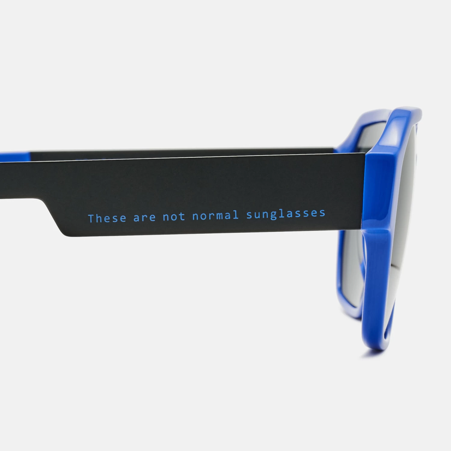 Gafas de sol unisex, con forma rectangular, de acetato grueso azul eléctrico con varilla ancha de metal negro. Descubre la frase impresa en su varilla! Sus lentes grises son polarizadas de alta calidad, para una mejor protección y confort.