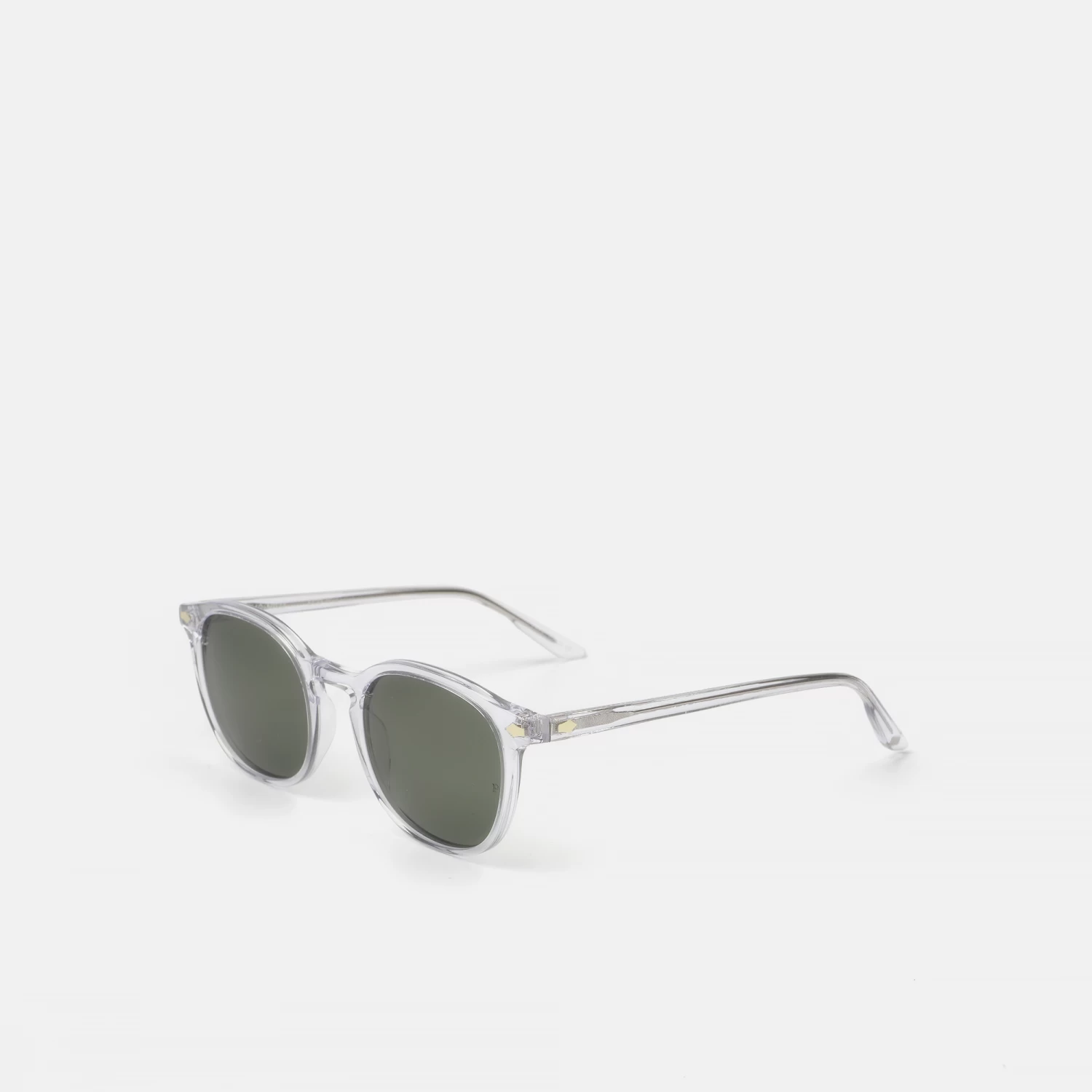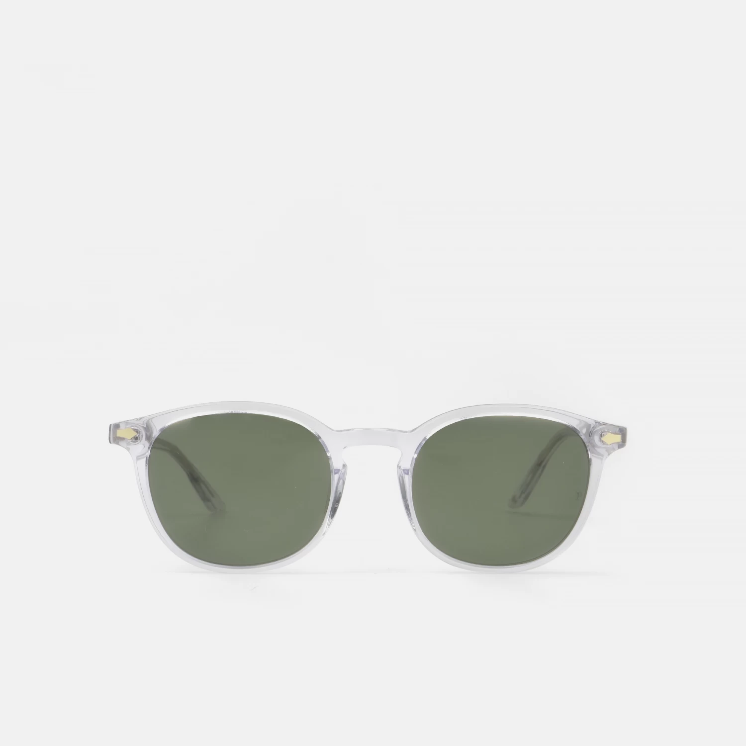 Gafas para hombre de forma geométrica en acetato de color cristal con detalle de metal color dorado en frente y varilla. Lentes color verde polarizadas.