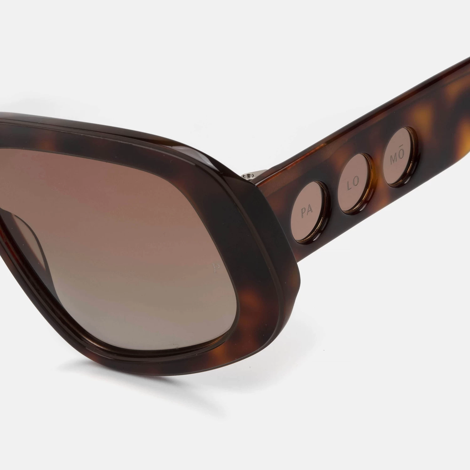 Gafas de sol creadas en colaboración con el renombrado diseñador cordobés Alejandro Palomo, de PALOMO SPAIN. El modelo Alejandro es unisex de silueta geométrica «oversize», estilo 70s en acetato de carey. Ofrece un diseño vanguardista para romper con lo establecido gracias a unas pequeñas lentes, que decoran ambas varillas. Las lentes de este modelo, son polarizadas, para obtener una visión más nítida y un mejor contraste.Este modelo incluye un estuche en formato «mini bolso» deportivo de polipiel, en color negro, con una tira que permite llevarlo colgado.