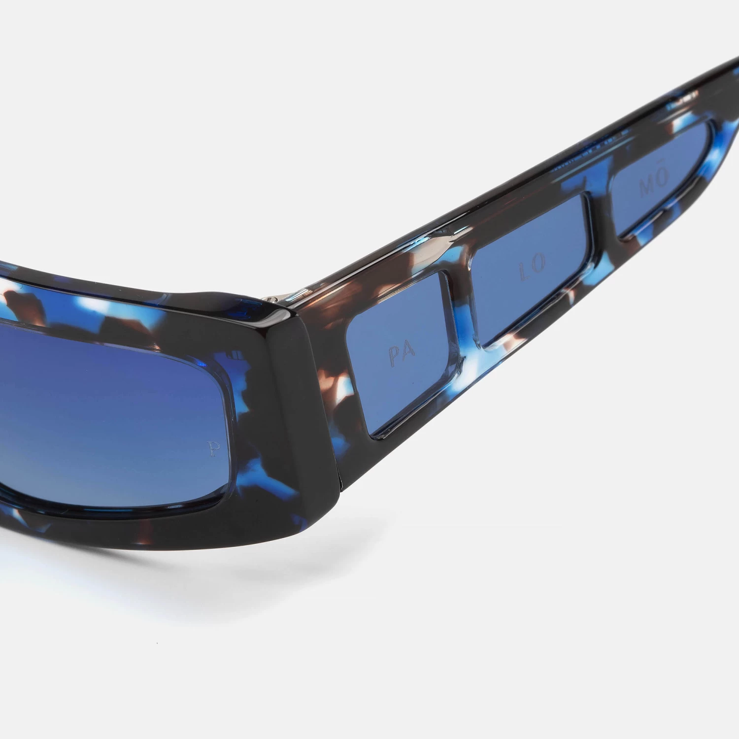 Gafas de sol creadas en colaboración con el renombrado diseñador cordobés Alejandro Palomo, de PALOMO SPAIN. El modelo Curro es unisex de silueta rectangular «oversize», de aire futurista en acetato de carey oscuro azulado.Ofrece un diseño vanguardista para romper con lo establecido gracias a unas pequeñas lentes, que decoran ambas varillas. Las lentes de este modelo, que prometen elevar cualquier look, son polarizadas, para obtener una visión más nítida y un mejor contraste.Este modelo incluye un estuche en formato «mini bolso» deportivo de polipiel, en color negro, con una tira que permite llevarlo colgado.