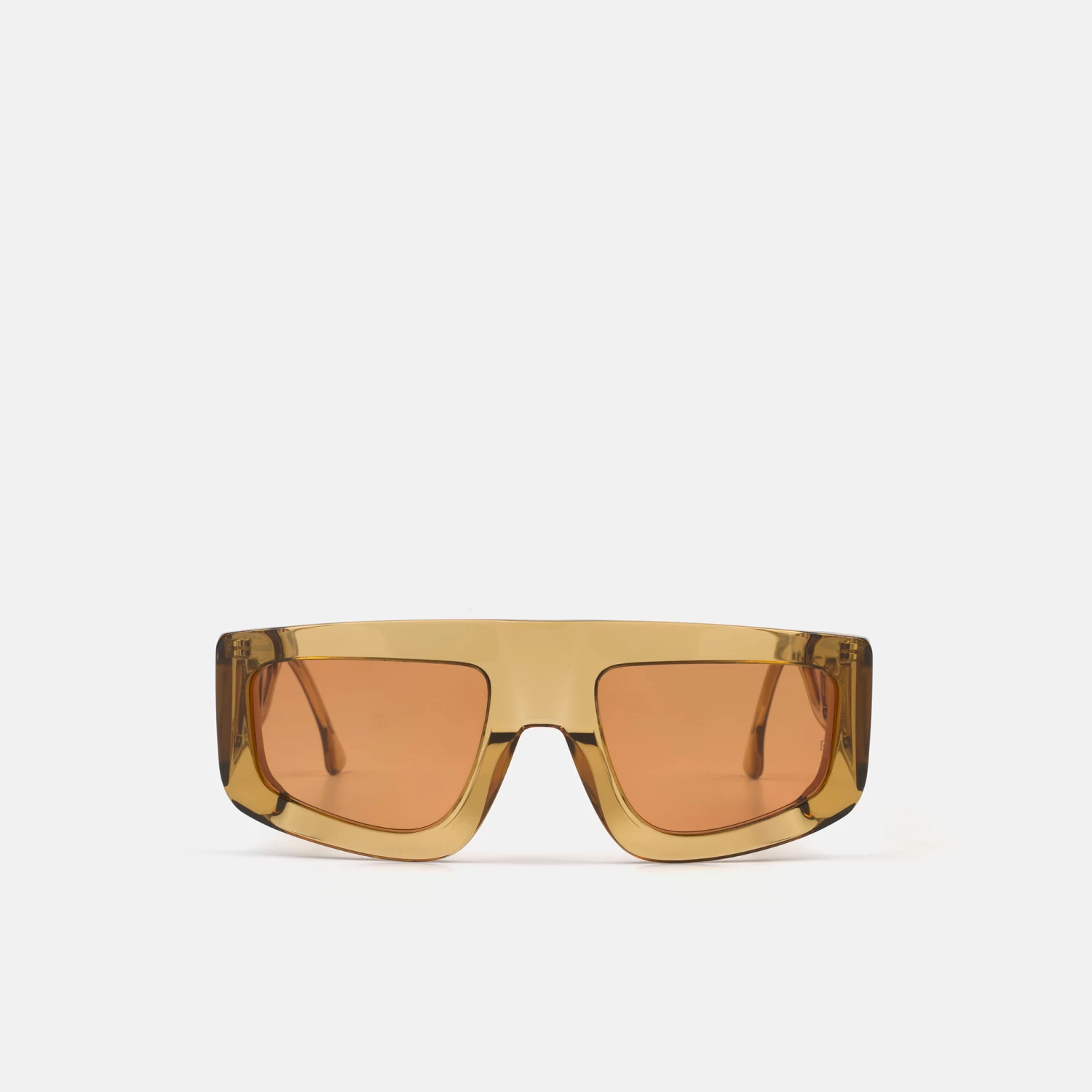 Irene es un modelo unisex que cuenta con una silueta aviador oversize, fabricada en acetato color marrón crystal.