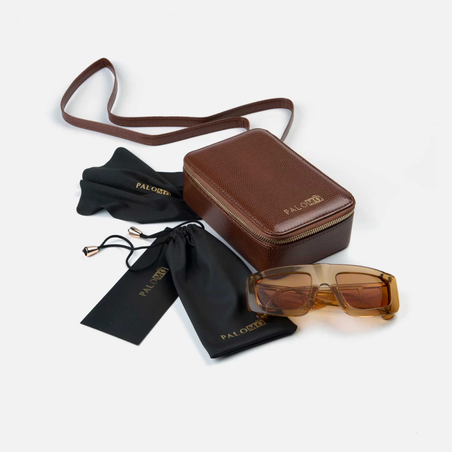 Por último, estas gafas incluyen un estuche formato «mini bolso» de polipiel en color marrón con una tira extra quepermite llevarlo colgado.