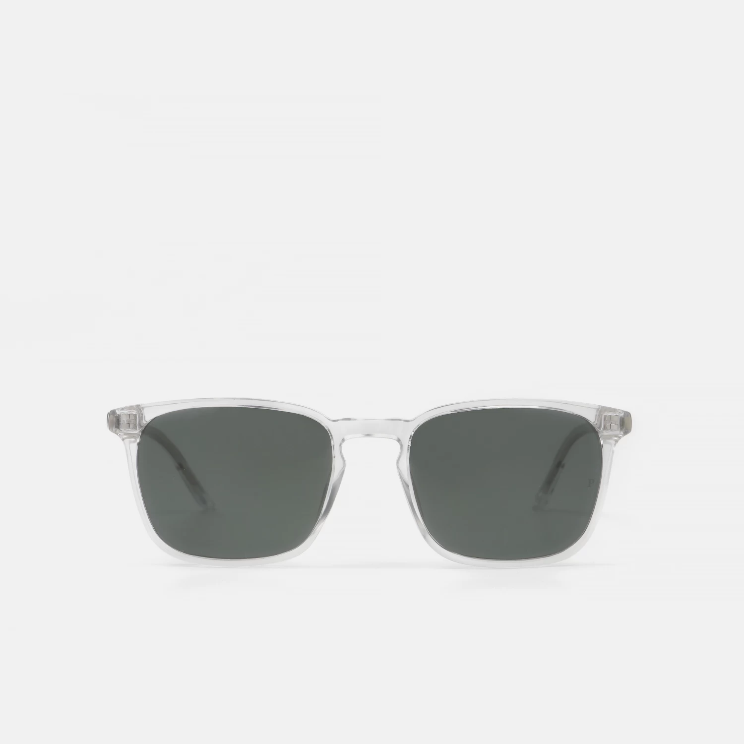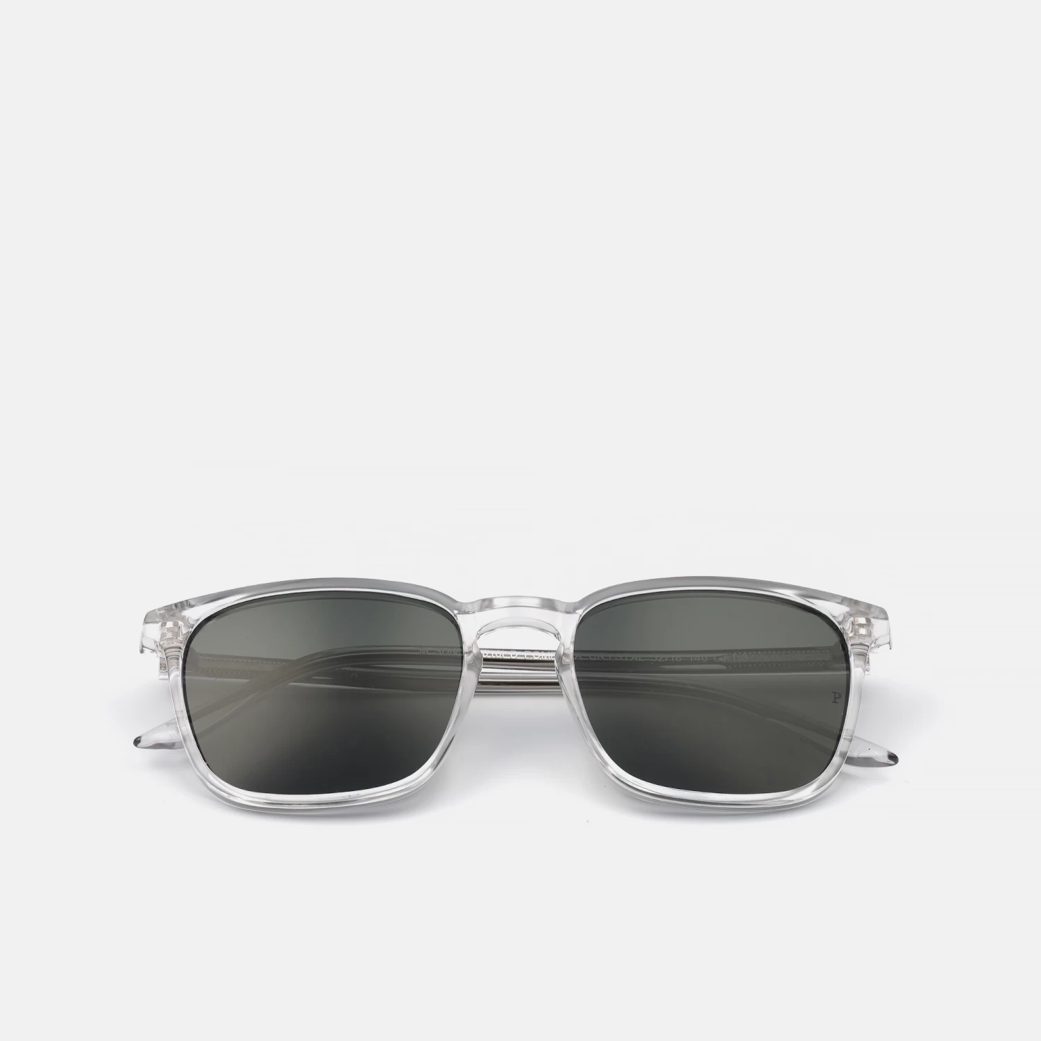 Gafas unisex, de silueta cuadrada, en acetato inyectado de color cristal. Con lentes color verde polarizadas.