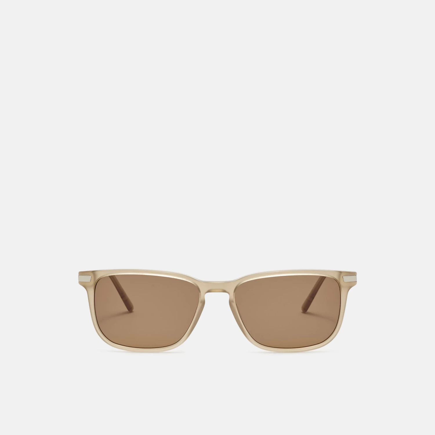 Gafas de sol para hombre, con forma rectangular, de acetato marrón. La varilla de metal cuenta con relieve texturizado, que aporta un toque más sofisticado. Sus lentes marrones de alta calidad, son polarizadas para una mayor protección y confort.