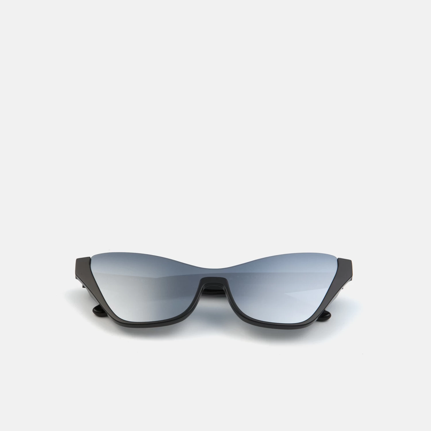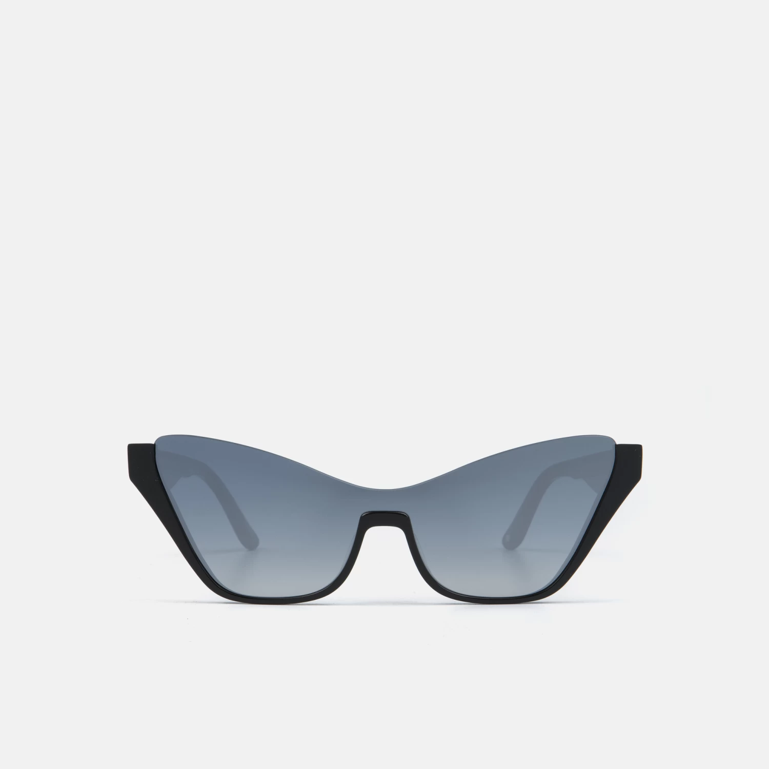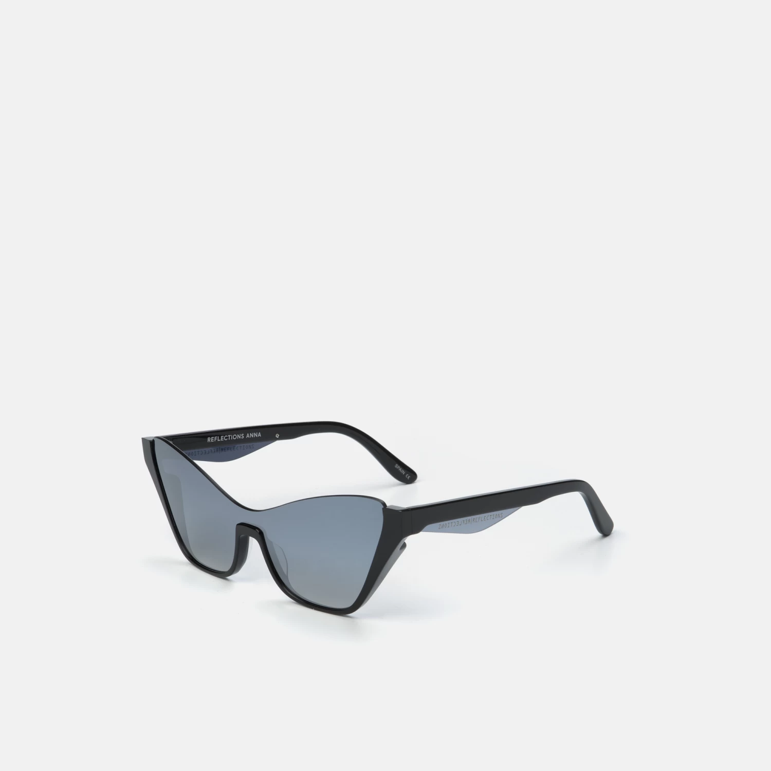 Se trata de una gafa tipo «cat-eye», fabricada con lente de policarbonato en tono plateado, sostenida por una estructura de acetato en color negro .