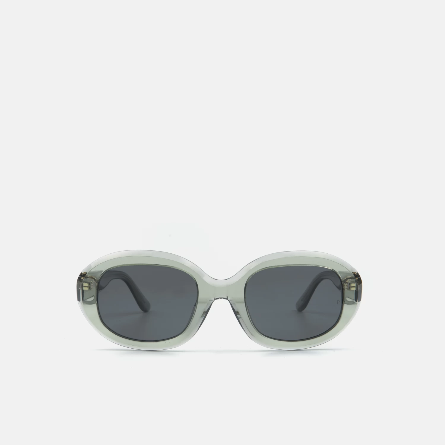 Gafas de sol de acetato verde crystal, con silueta ovalada «oversize». Las varillas lucen unas piezas de metal dorado que aportan modernidad y elegancia.