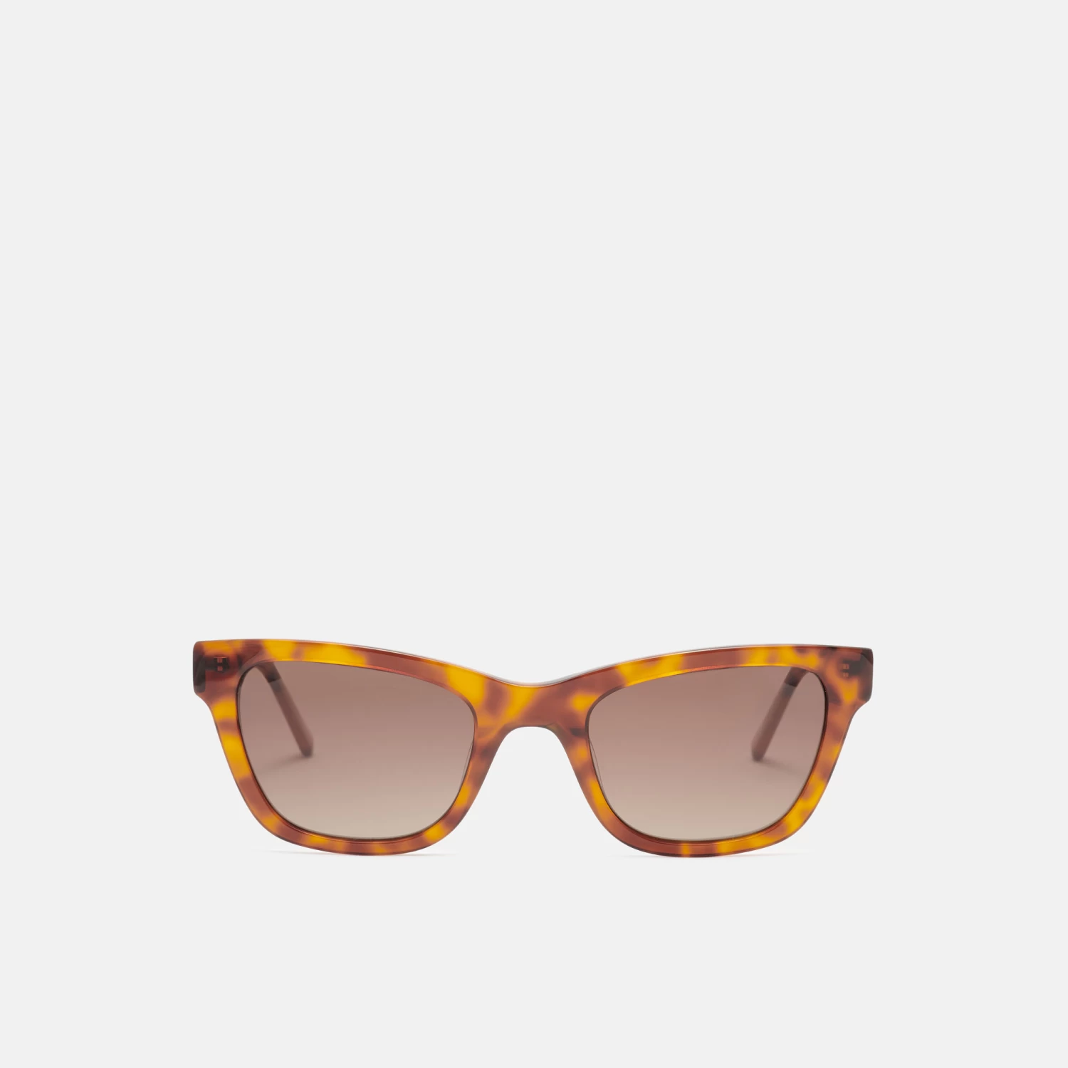 El modelo Mó Sottsass de la colección BLOCKS inspirada en la geométrica colorida con origen en el grupo artístico Memphis. Hecha en acetato con silueta cat-eye, frontal en color carey y varilla en bloques de color carey y morado. Sus lentes marrones degradadas de alta calidad, son polarizadas para una mayor protección y confort. Estas gafas son un complemento original y atrevido para completar cualquier look.
