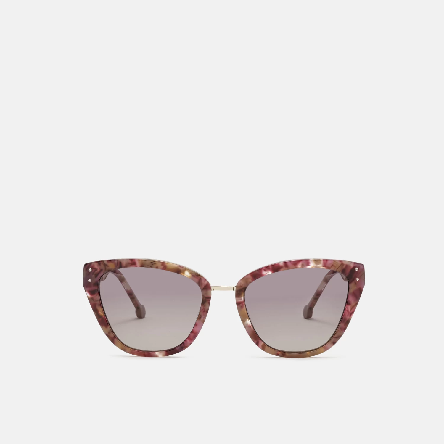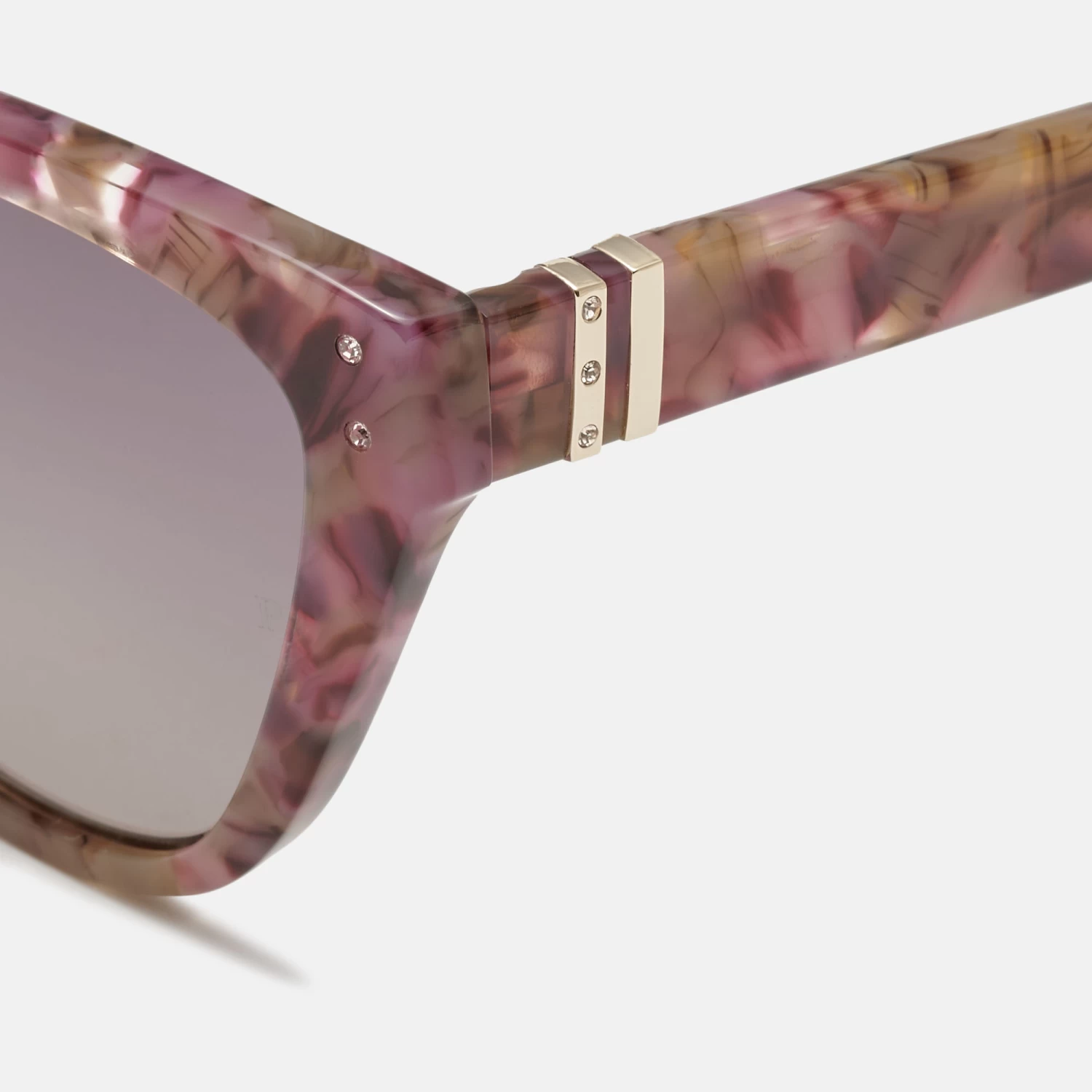 Gafas de sol para mujer, con forma «cat-eye» relajada, en acetato rosado veteado. El frente y varilla cuentan con piezas metálicas en relieve y brillo, que aportan un toque más sofisticado. Sus lentes rosas degradadas de alta calidad, son polarizadas para una mayor protección y confort.