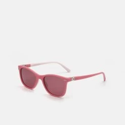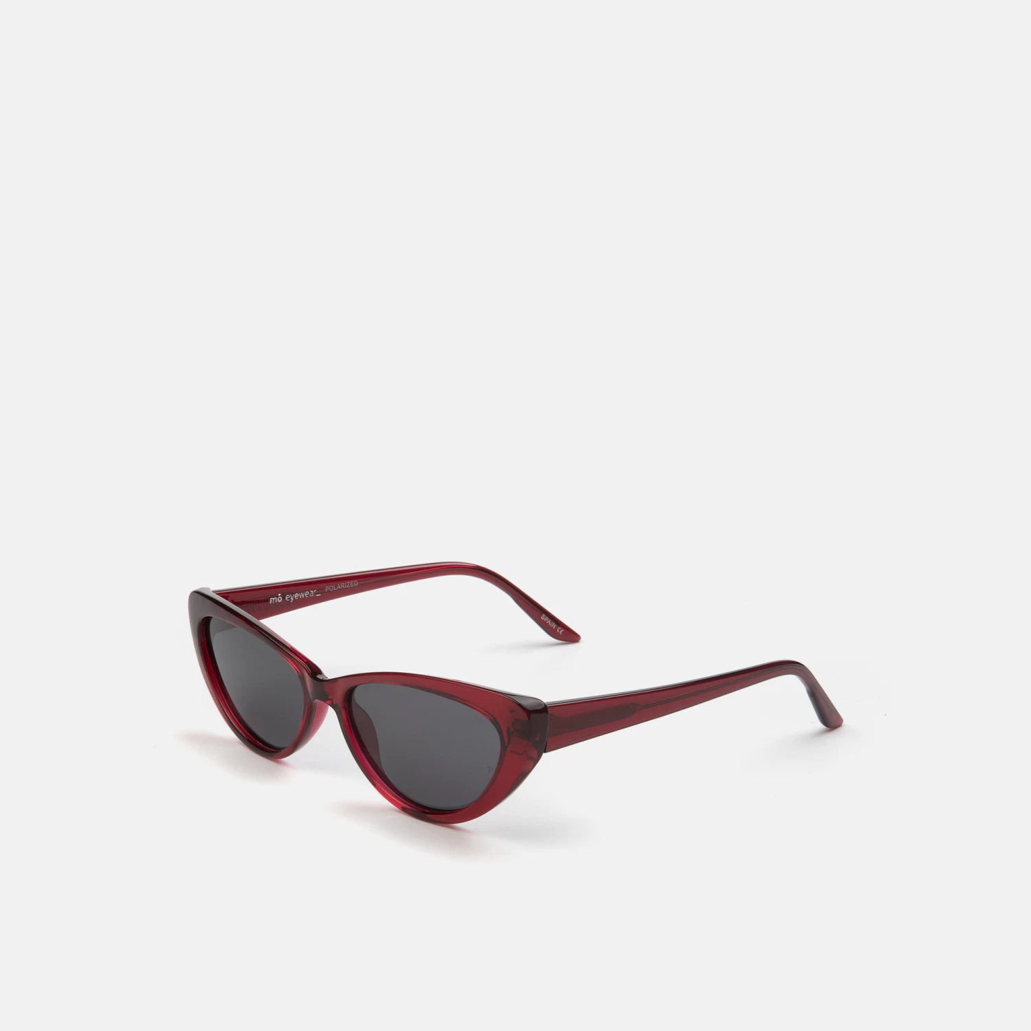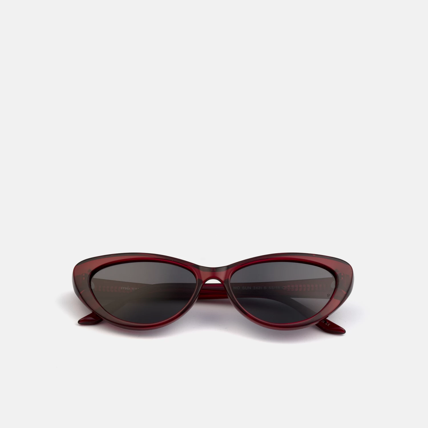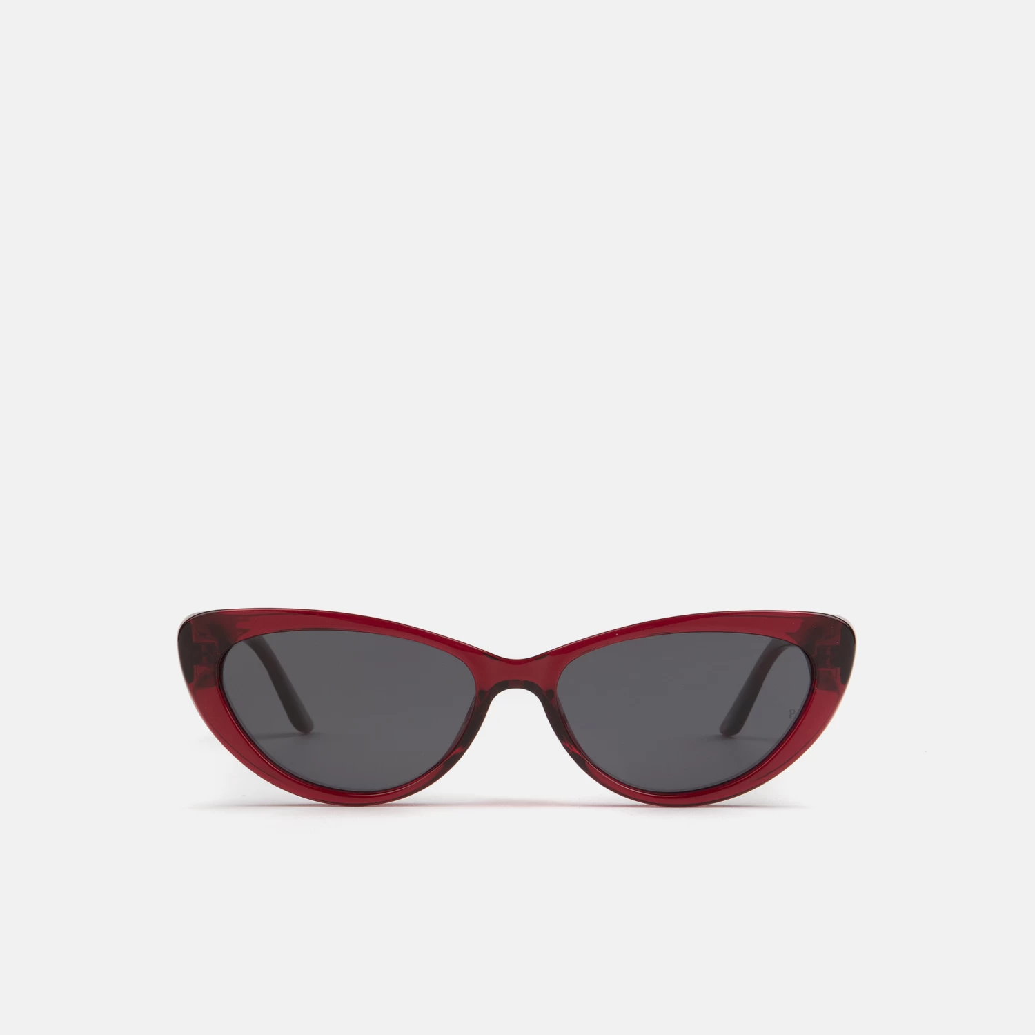 Gafas para mujer estilo cat-eye, fabricadas en pasta color cristal rojo, con lentes grises de categoría 3 polarizadas.