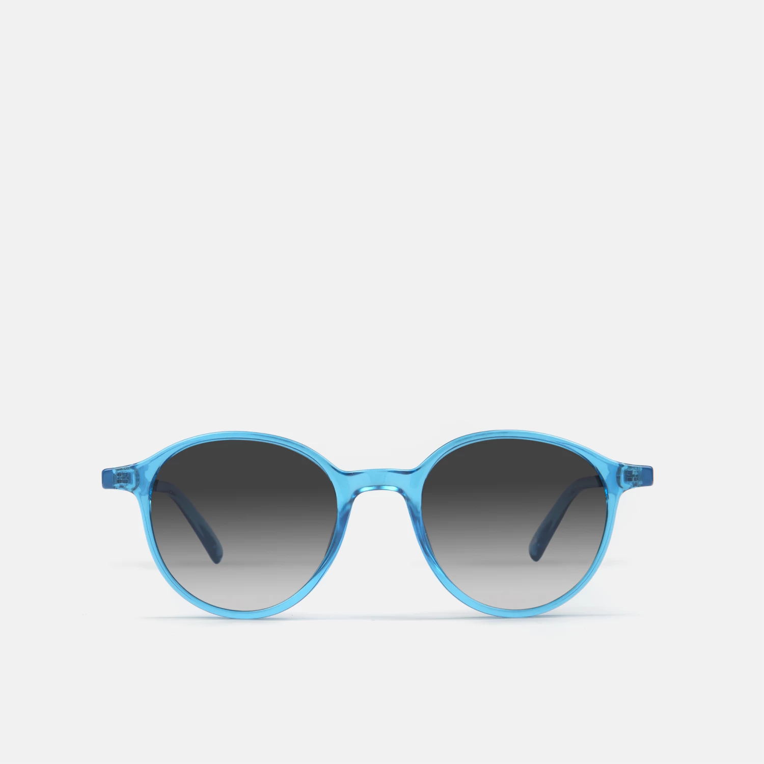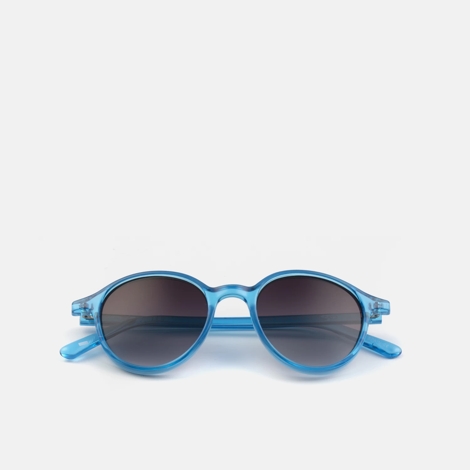 Gafas de sol para niños, con silueta redonda, de pasta azul y lente degradada gris.